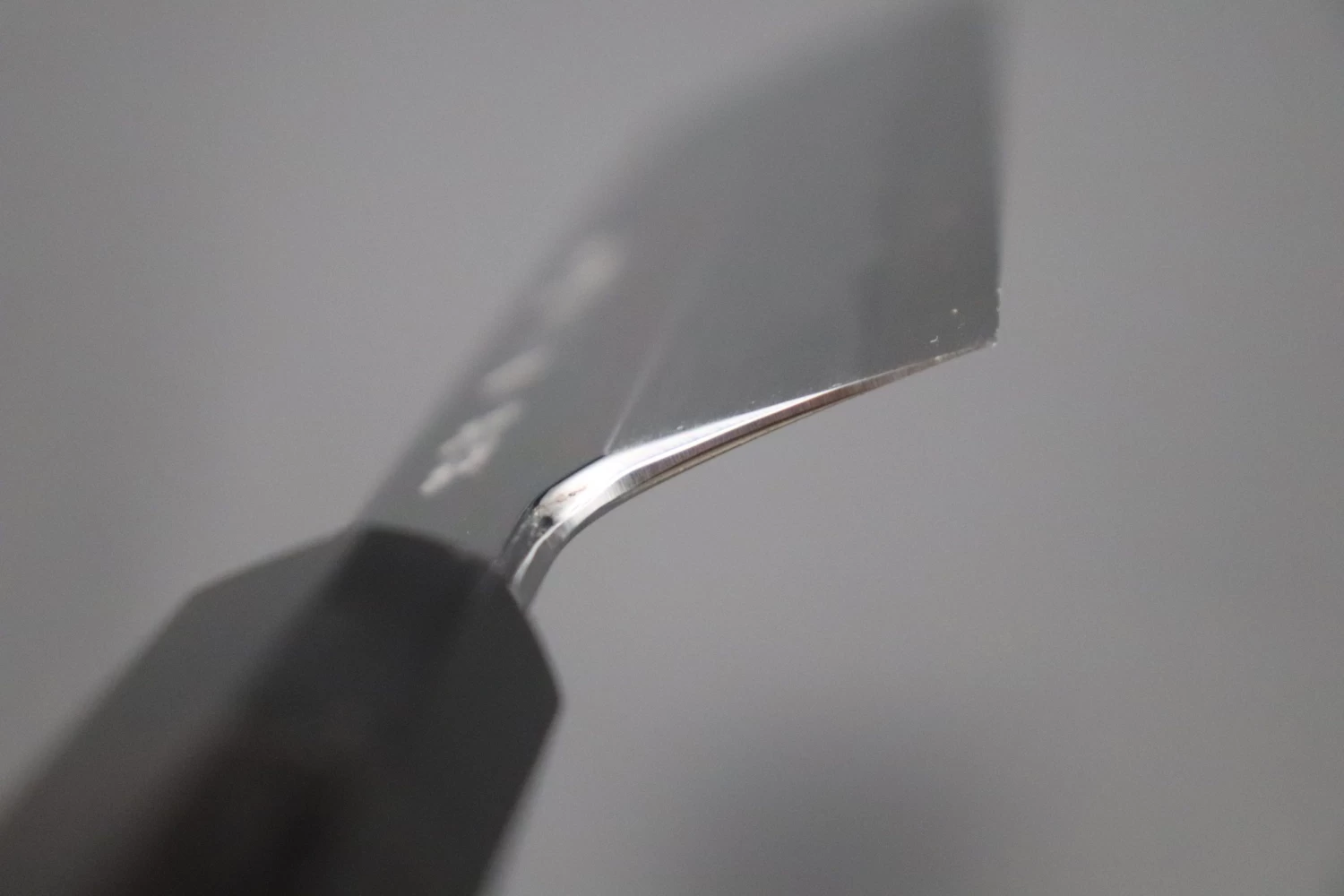 Japanese Traditional Style “Wa-Bocho” knives generally come with Single bevel edge for right handed use (the opposite side of blade is ground flat with slightly concaved shape). The reverse grinding left handed version is also available at 50% extra of regular price. (Sorry for much extra! Due to a small demand for the left handed version in Japan, it is costly to run a special small production from the beginning step). We try to keep the left handed versions in stock, but once sold out, it may take 60 to 90 days for delivery. Please contact us first for the availability at email.