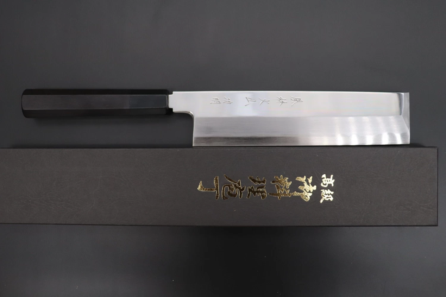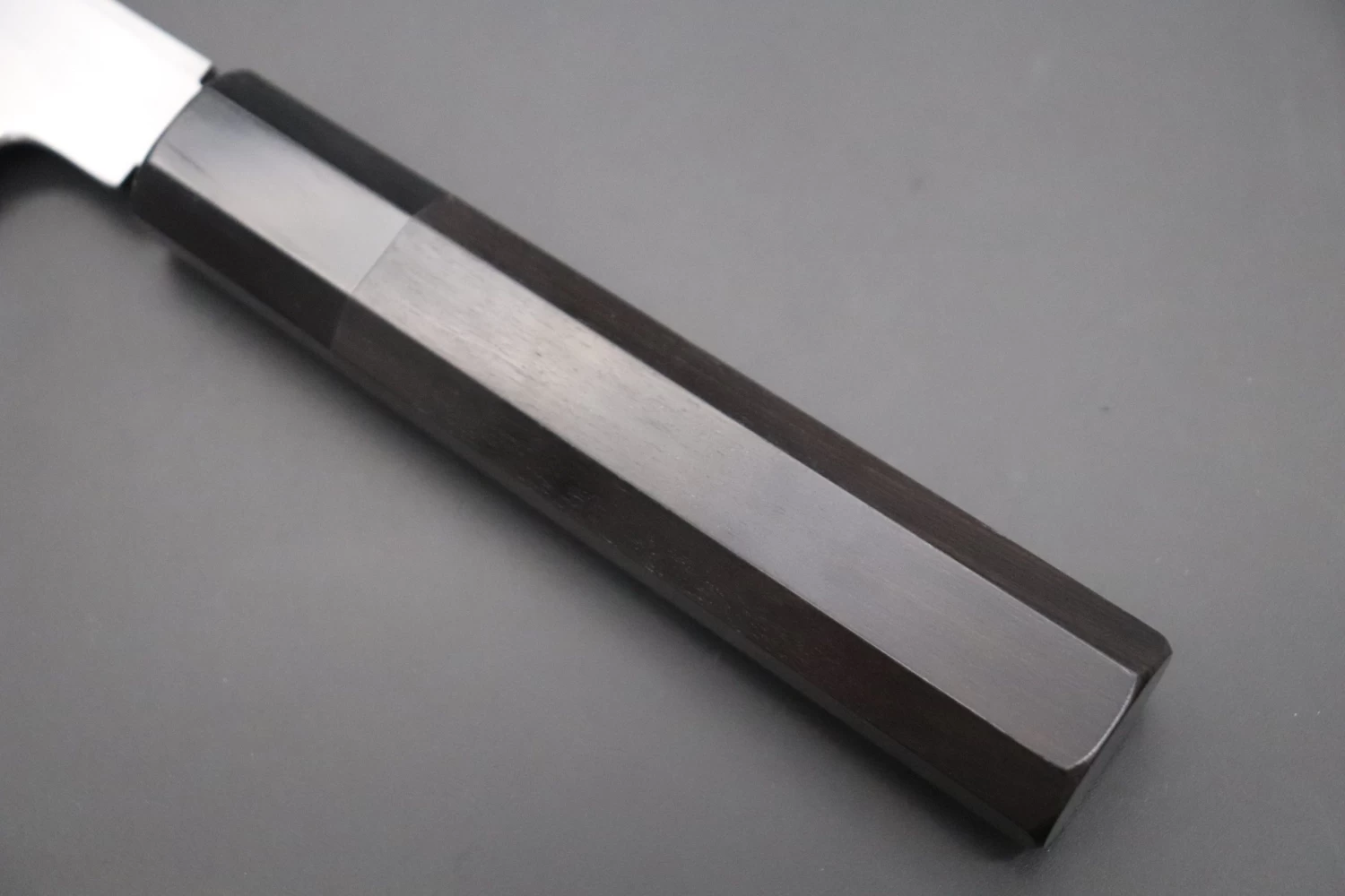 This is the special order made Fu-Rin-Ka-Zan Limited Model, Hon Kasumi Blue Steel No.1 Usuba Knife and available with limited quantity. Beautiful Masterpiece of Mirror Polished Blue Steel No.1 Usuba Knife comes with Octagon Shaped Ebony Wood Handle and hand crafted Magnolia Wooden Handle.