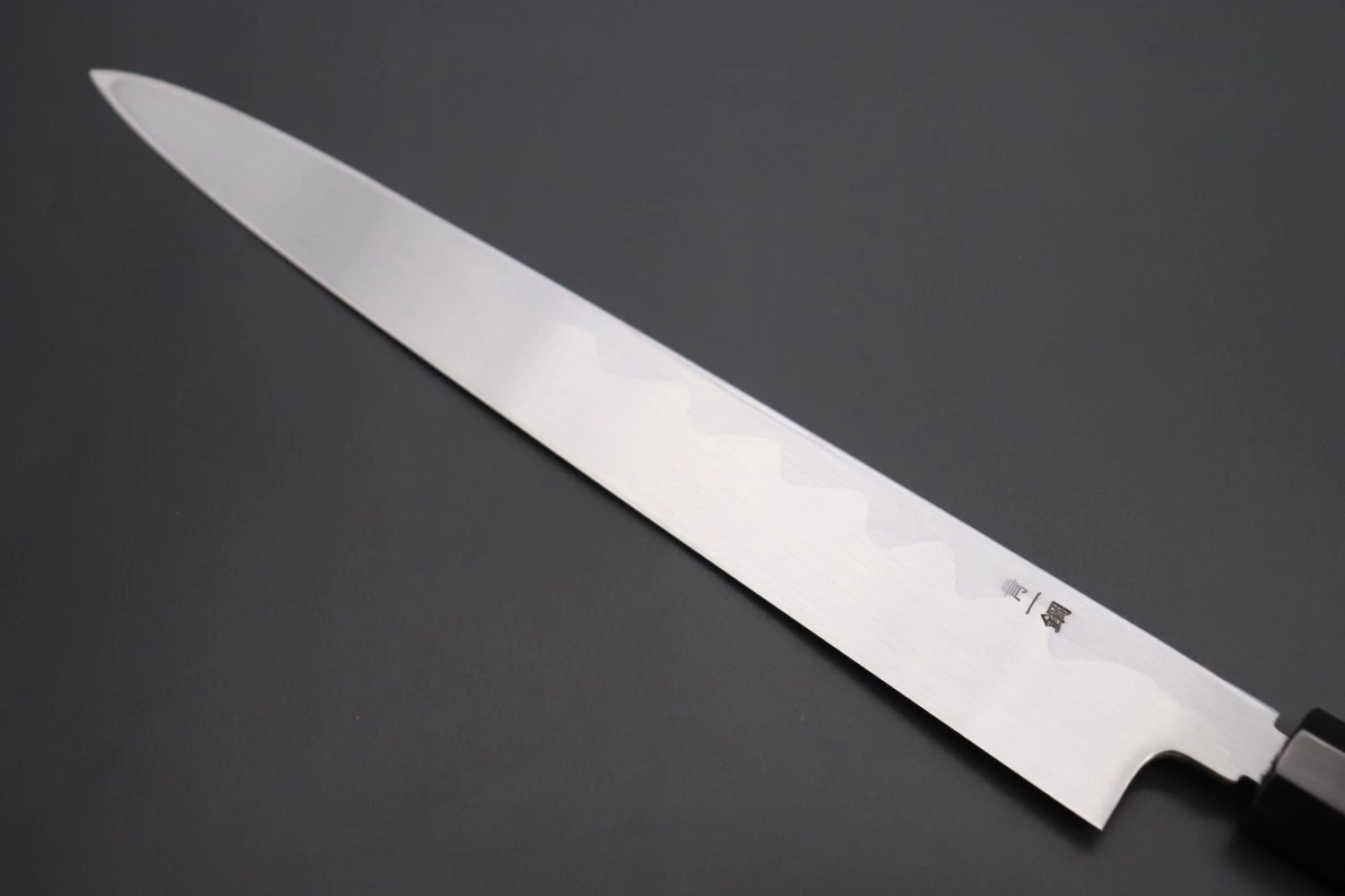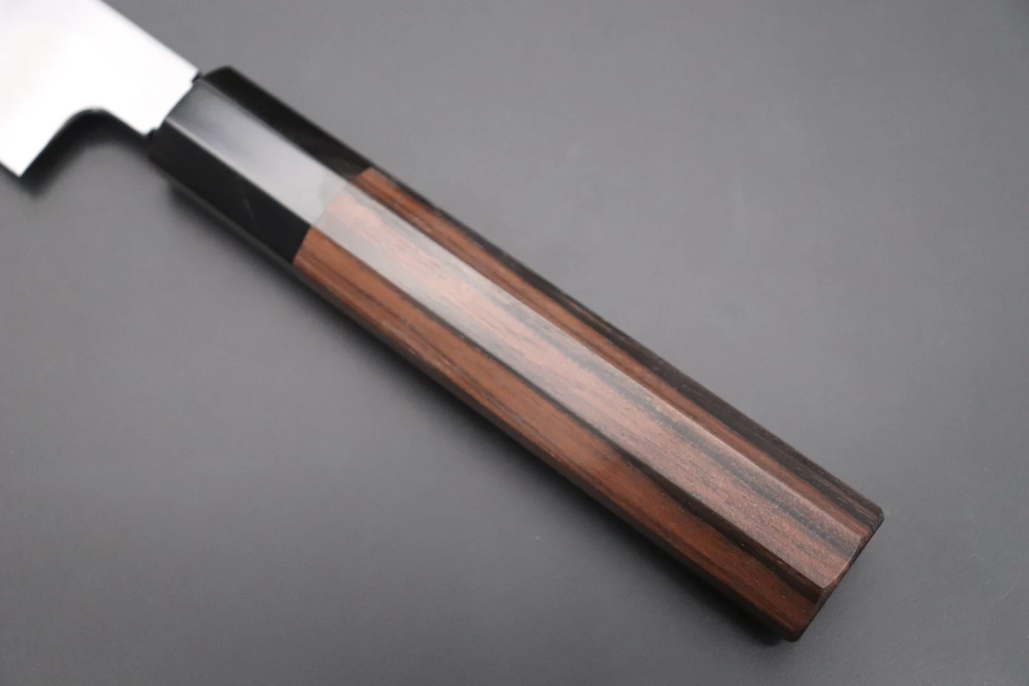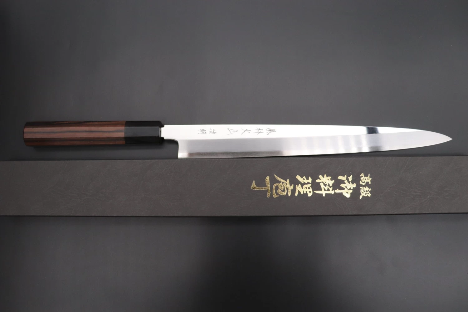 This is the special order made Fu-Rin-Ka-Zan Limited Model, Hon Kasumi Blue Steel No.1 Yanagiba Knife and available with limited quantity. Beautiful Masterpiece of Mirror Polished Blue Steel No.1 Yanagiba comes with Octagon Shaped Ebony Wooden Handle and hand crafted Magnolia Wooden Handle.