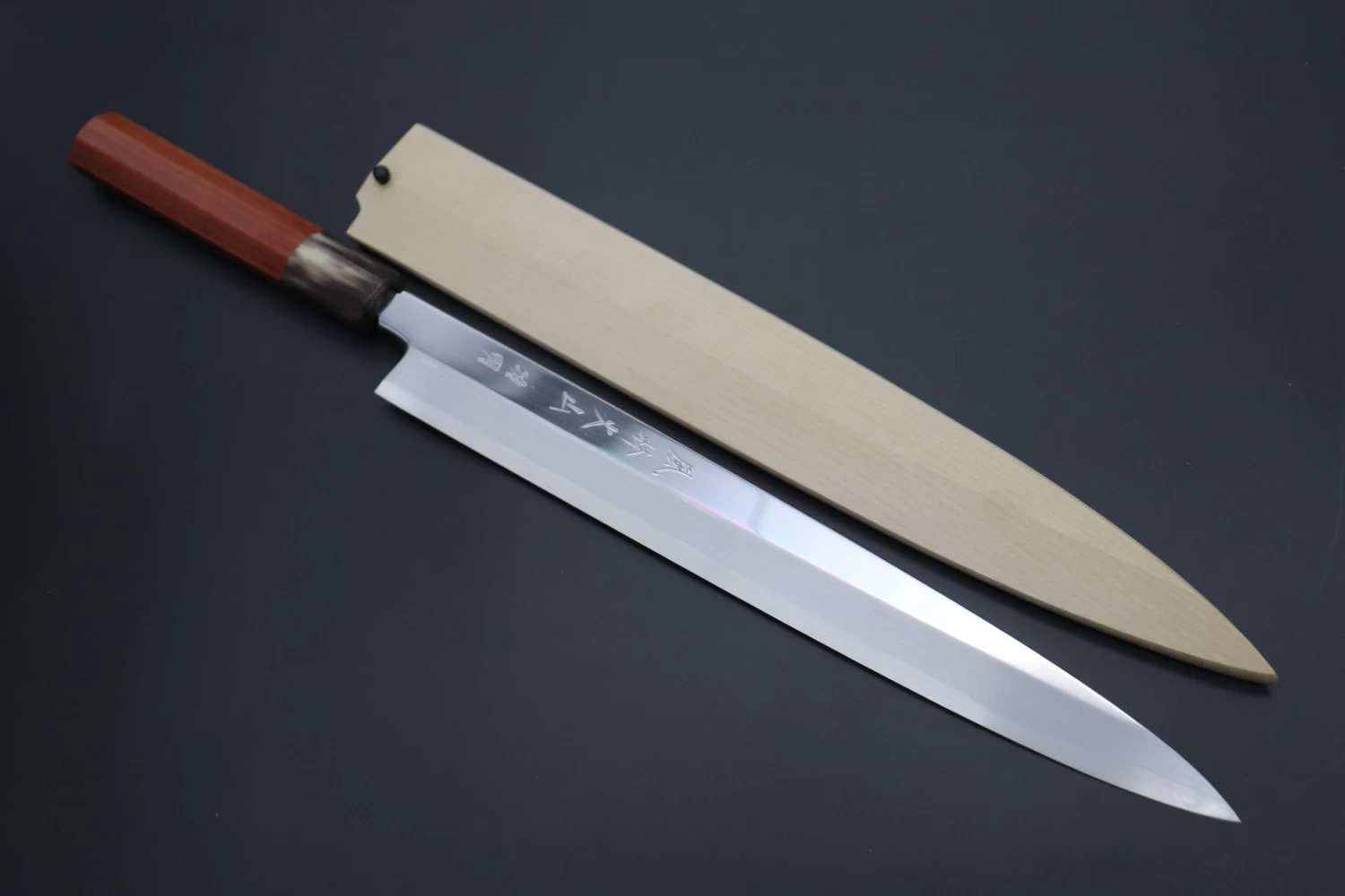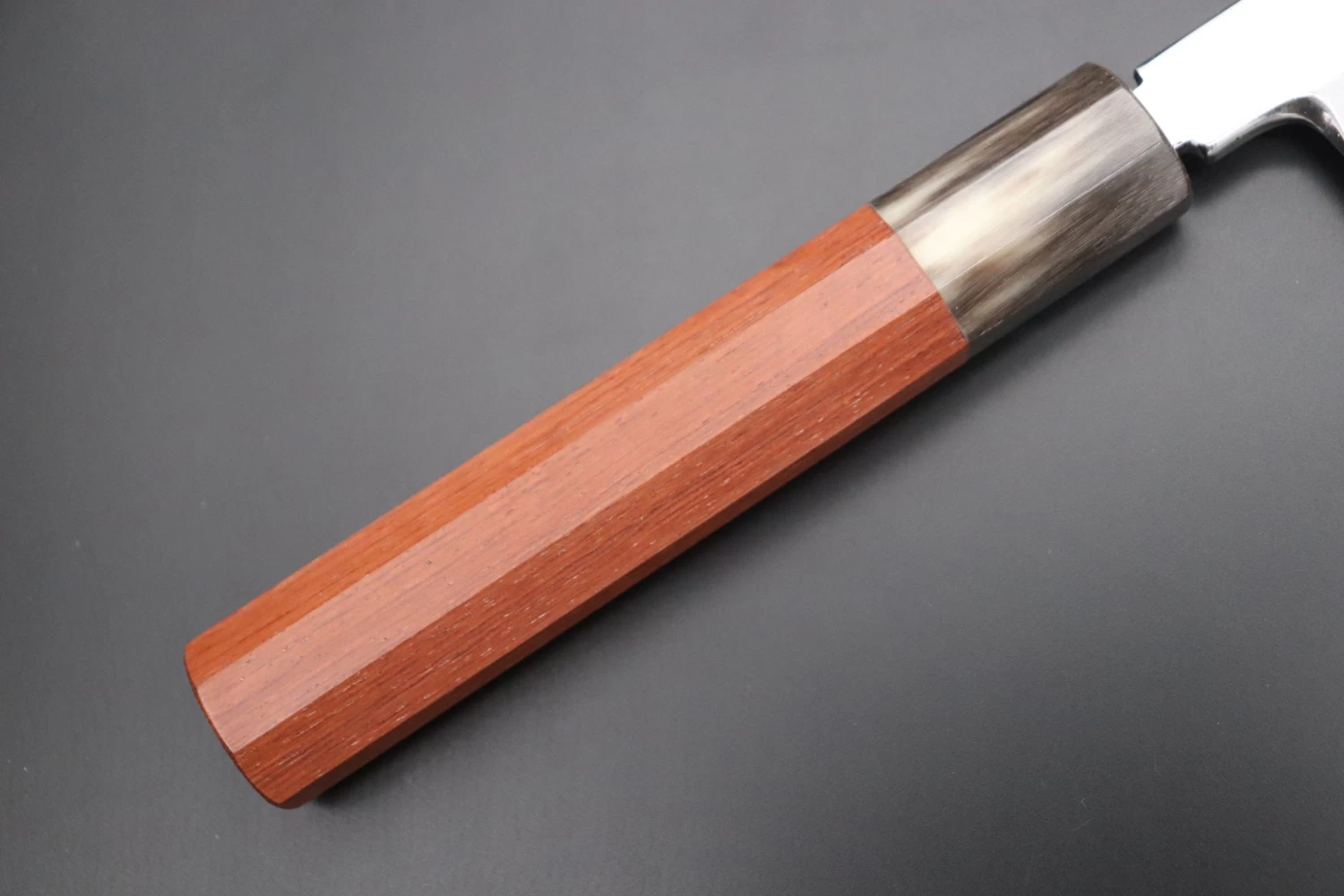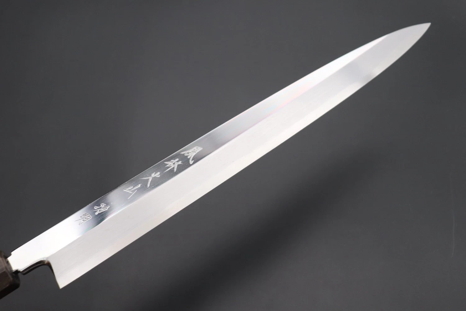 This is the special order made Fu-Rin-Ka-Zan Limited Model, Hon Kasumi Blue Steel No.1 Yanagiba Knife and available with limited quantity. Beautiful Masterpiece of Mirror Polished Blue Steel No.1 Yanagiba comes with Octagon Shaped Quince Wood Handle and hand crafted Magnolia Wooden Handle.
