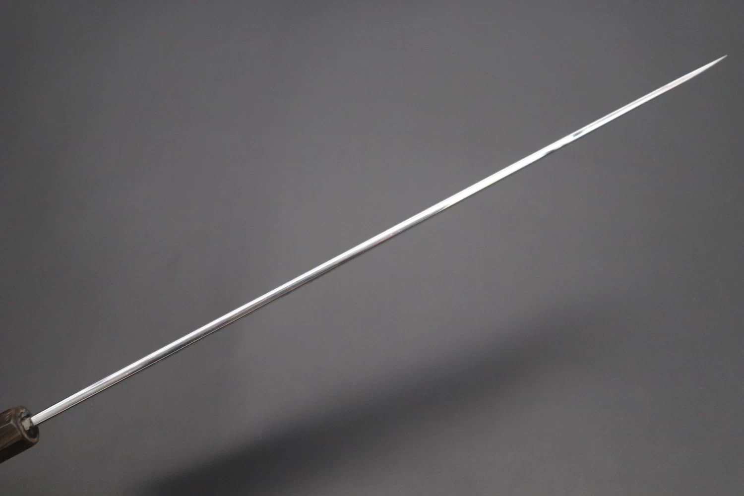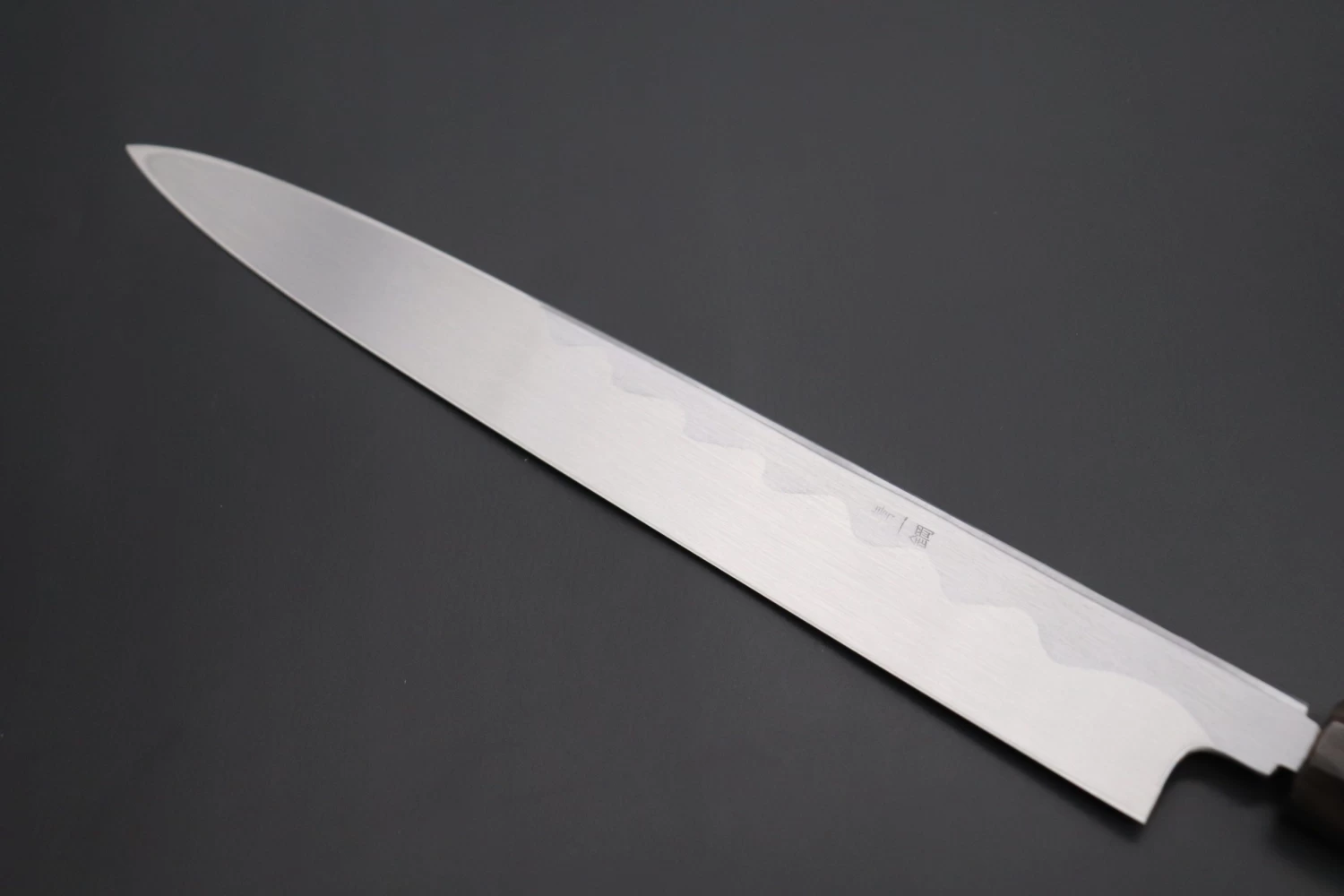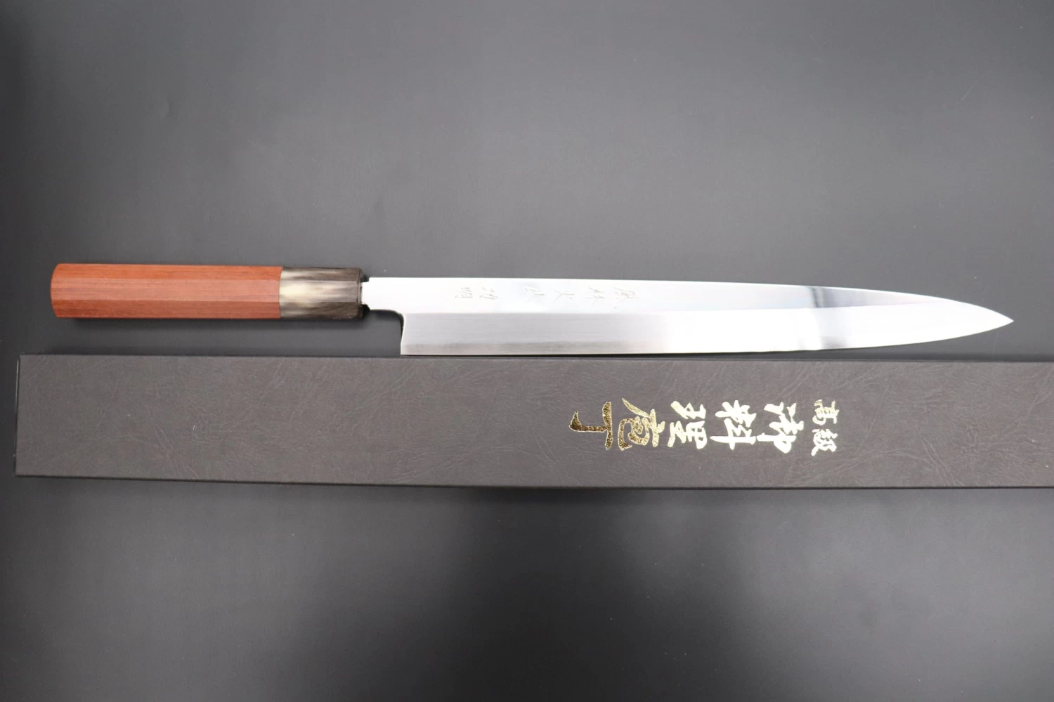 This is the special order made Fu-Rin-Ka-Zan Limited Model, Hon Kasumi Blue Steel No.1 Yanagiba Knife and available with limited quantity. Beautiful Masterpiece of Mirror Polished Blue Steel No.1 Yanagiba comes with Octagon Shaped Quince Wood Handle and hand crafted Magnolia Wooden Handle.