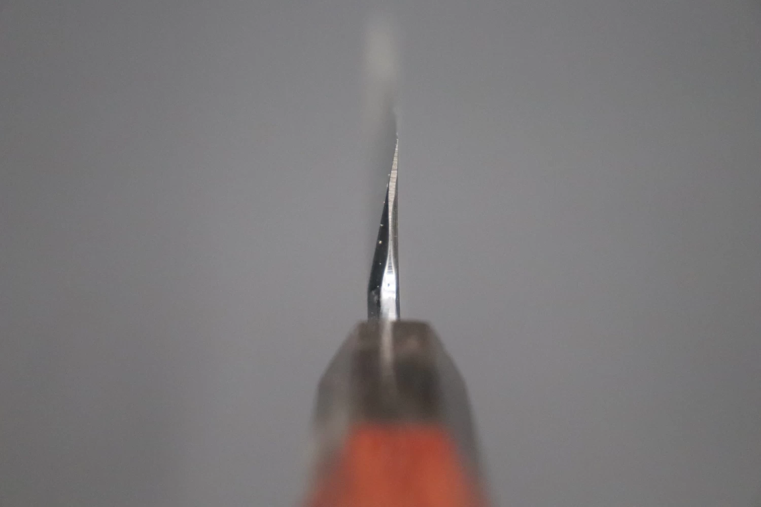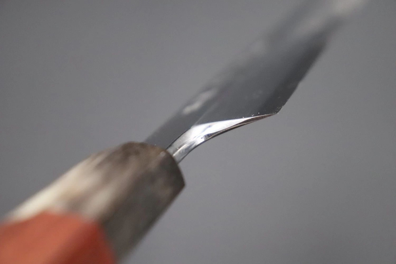 Japanese Traditional Style “Wa-Bocho” knives generally come with Single bevel edge for right handed use (the opposite side of blade is ground flat with slightly concaved shape). The reverse grinding left handed version is also available at 50% extra of regular price. (Sorry for much extra! Due to a small demand for the left handed version in Japan, it is costly to run a special small production from the beginning step). We try to keep the left handed versions in stock, but once sold out, it may take 60 to 90 days for delivery. Please contact us first for the availability at email.