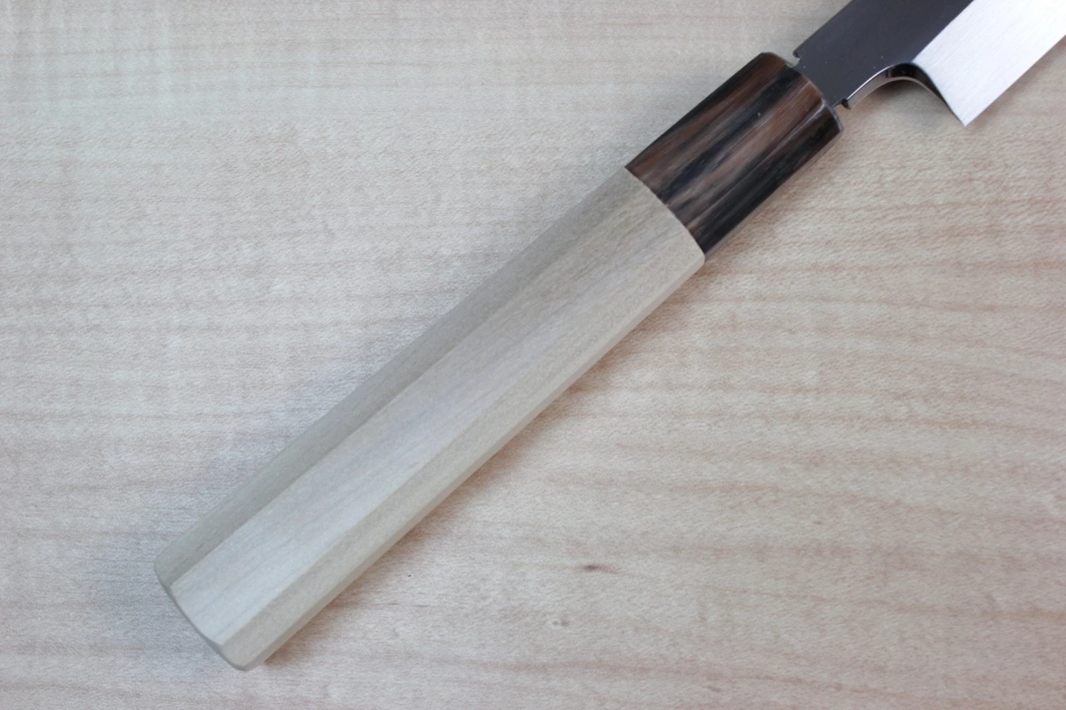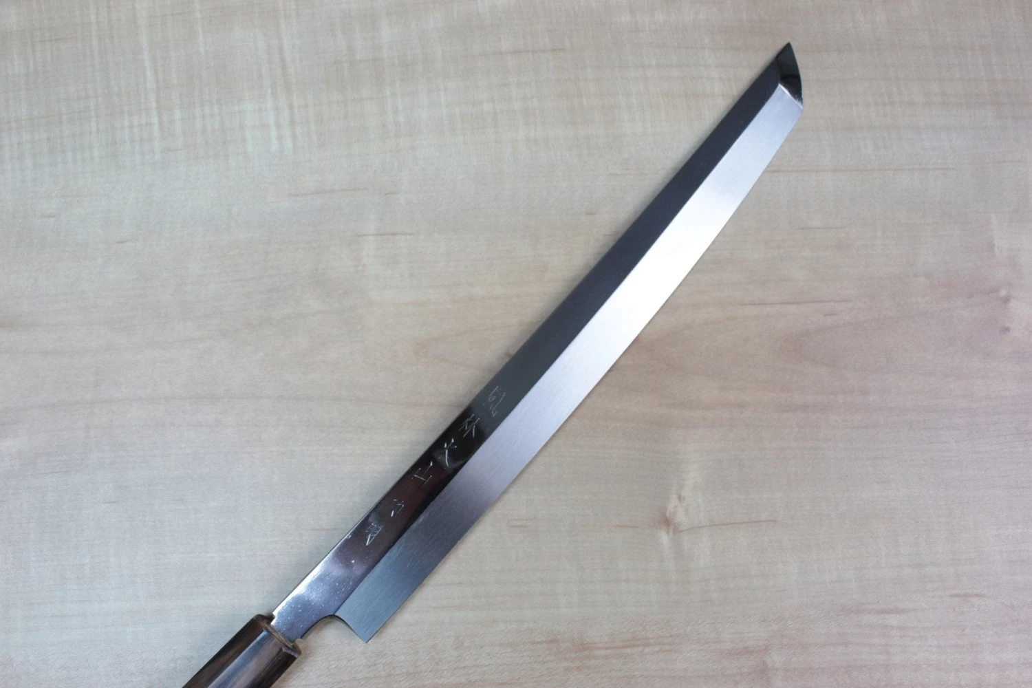 The Sakimaru Takohiki is a variation of the Yanagiba and Takohiki, and is used for much the same purposes. Sakimaru Takohiki are easily identifiable by their blade tips, which look similar to that of a Katana. Their blades have a straight spine similar to the Takohiki, and a slightly curved edge like the Yanagiba, resulting in a knife which looks somewhat like a combination of the two.