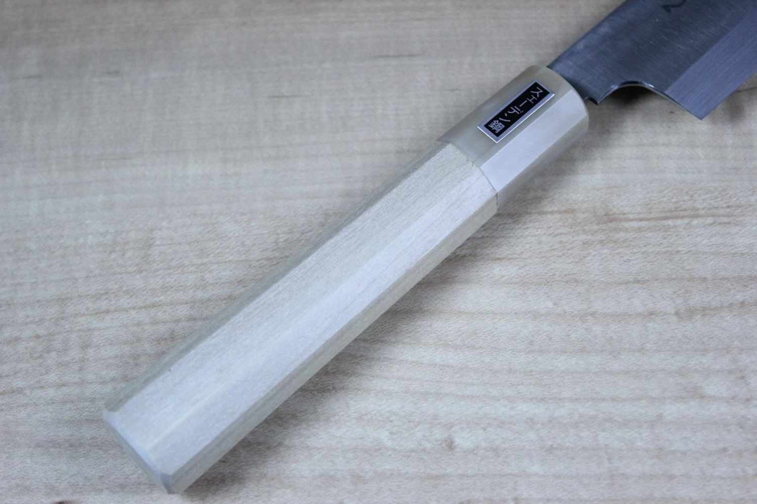 Japanese traditional-style octagonal handle is made from magnolia wood, and have a water buffalo horn ferrule. Each knife also includes a matching magnolia wood Saya (“Sheath”) for safekeeping.