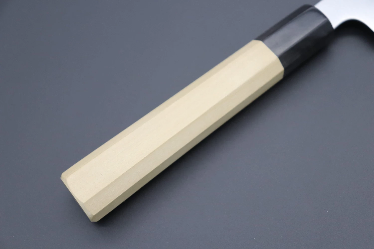 This knife has a comfortable octagonal magnolia wood handle, which has a buffalo horn ferrule. For safekeeping, this knife comes with a matching magnolia wood Saya (Sheath) with a black pakkawood Saya pin.