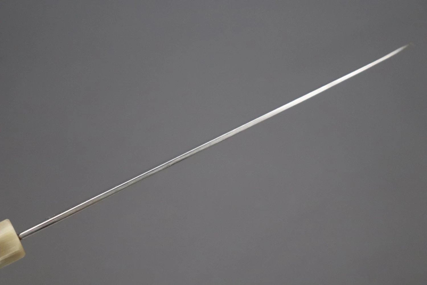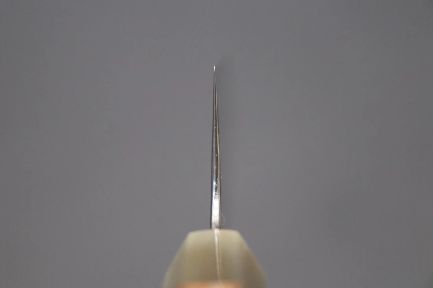 This knife has a unique natural wooden texture of octagonal Bocote wood handle, which has a buffalo horn ferrule.(Sukenari carefully selects the Japan’s Premium Wa Handle craftsman for handcrafting this premium wood Wa Handle). For safekeeping, this knife comes with a matching Black Lacquered wood Saya (Sheath) with a black pakkawood Saya pin.