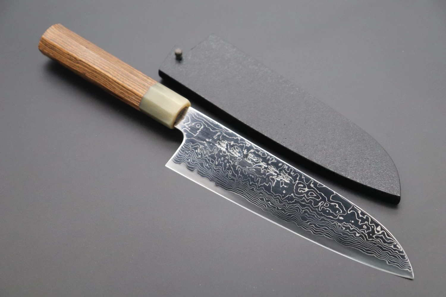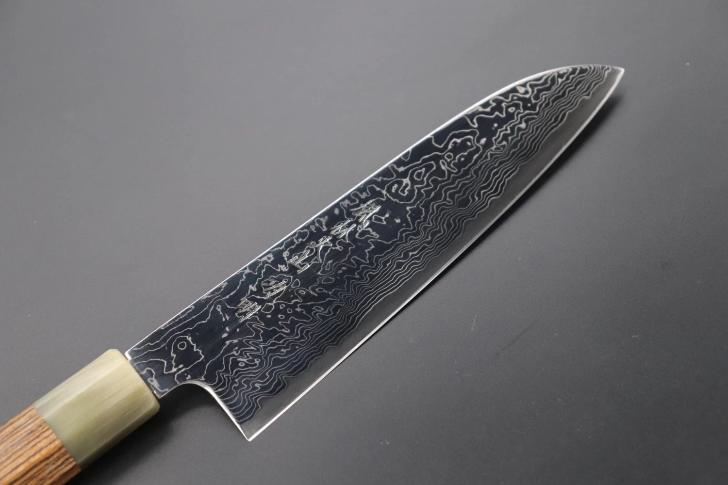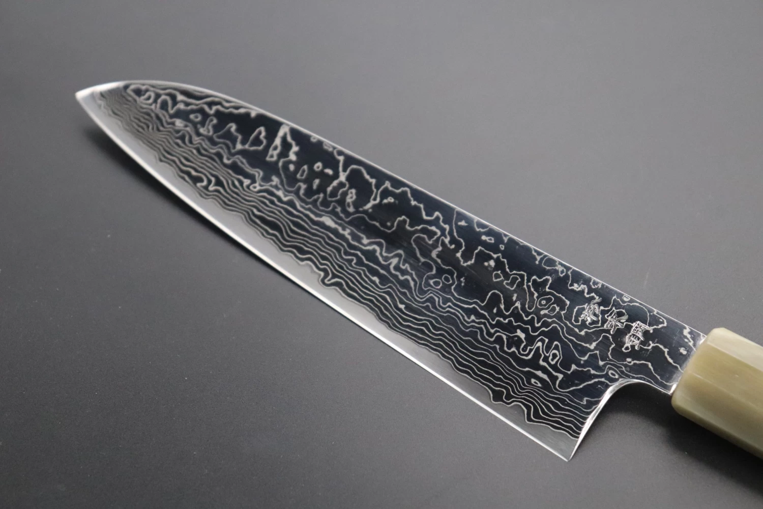 This beautiful Damascus Wa Santku is forged and hand crafted by passionate forge-smith Sukenari using R-2 steel. R-2 is high quality Powdered Metallurgy (P.M.) High Speed Tool Steel from Kobelco. R-2 has a very rich chemical composition, which includes Carbon 1.25-1.45 %, Chromium 14- 16%, Molybdenum 2.3- 3.3 %, and Vanadium 1.8- 2.2 %.