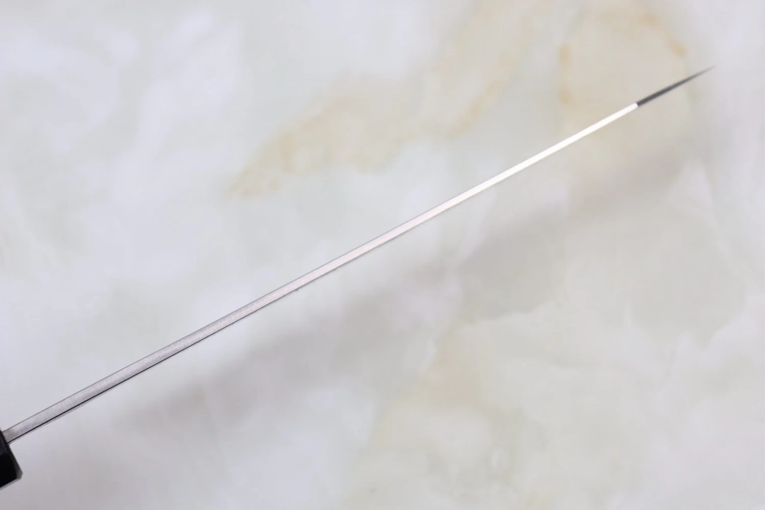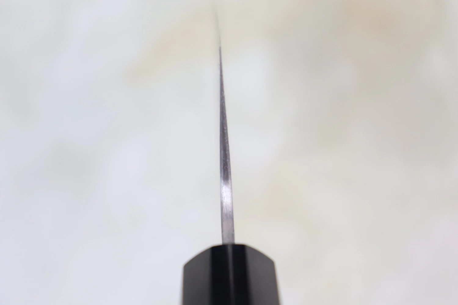 We requested that Master Yamamoto produce these knives using his fine hammer forging process and R-2 Powdered metallurgy steel. His traditional hammer forging technique makes the micro-structure of the steel finer, allowing the production of a very stable cutting edge that provides superior edge retention and cutting performance. In fact, the edge retention of Master Yamamoto’s R-2 blades is comparable to other famous powdered steels, such as ZDP-189 and Cowry-X.