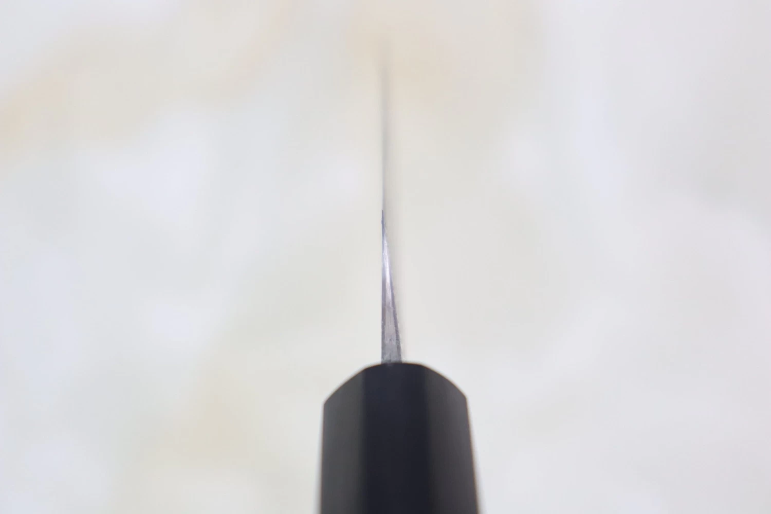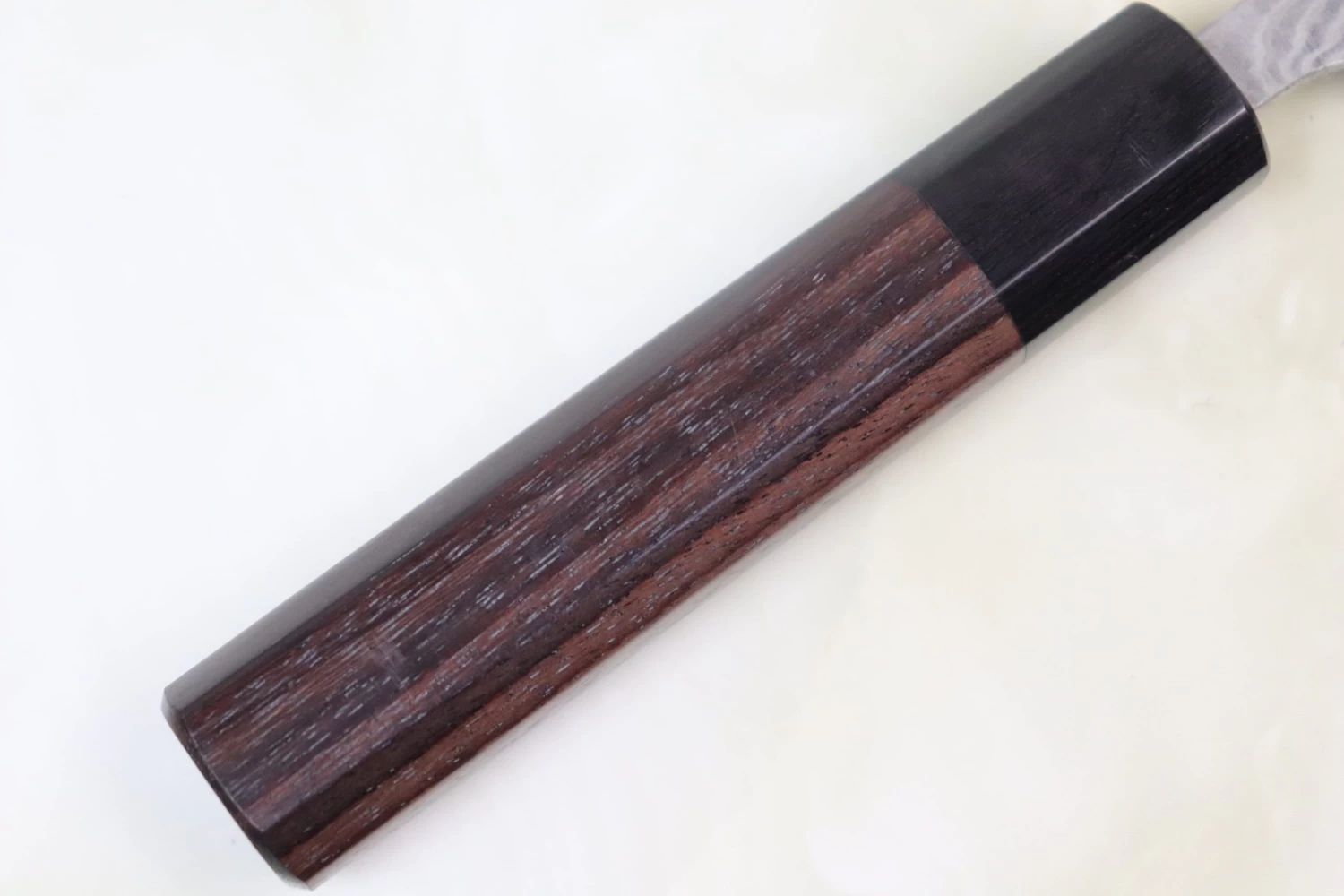 We requested that Master Yamamoto produce these knives using his fine hammer forging process and R-2 Powdered metallurgy steel. His traditional hammer forging technique makes the micro-structure of the steel finer, allowing the production of a very stable cutting edge that provides superior edge retention and cutting performance. In fact, the edge retention of Master Yamamoto’s R-2 blades is comparable to other famous powdered steels, such as ZDP-189 and Cowry-X.