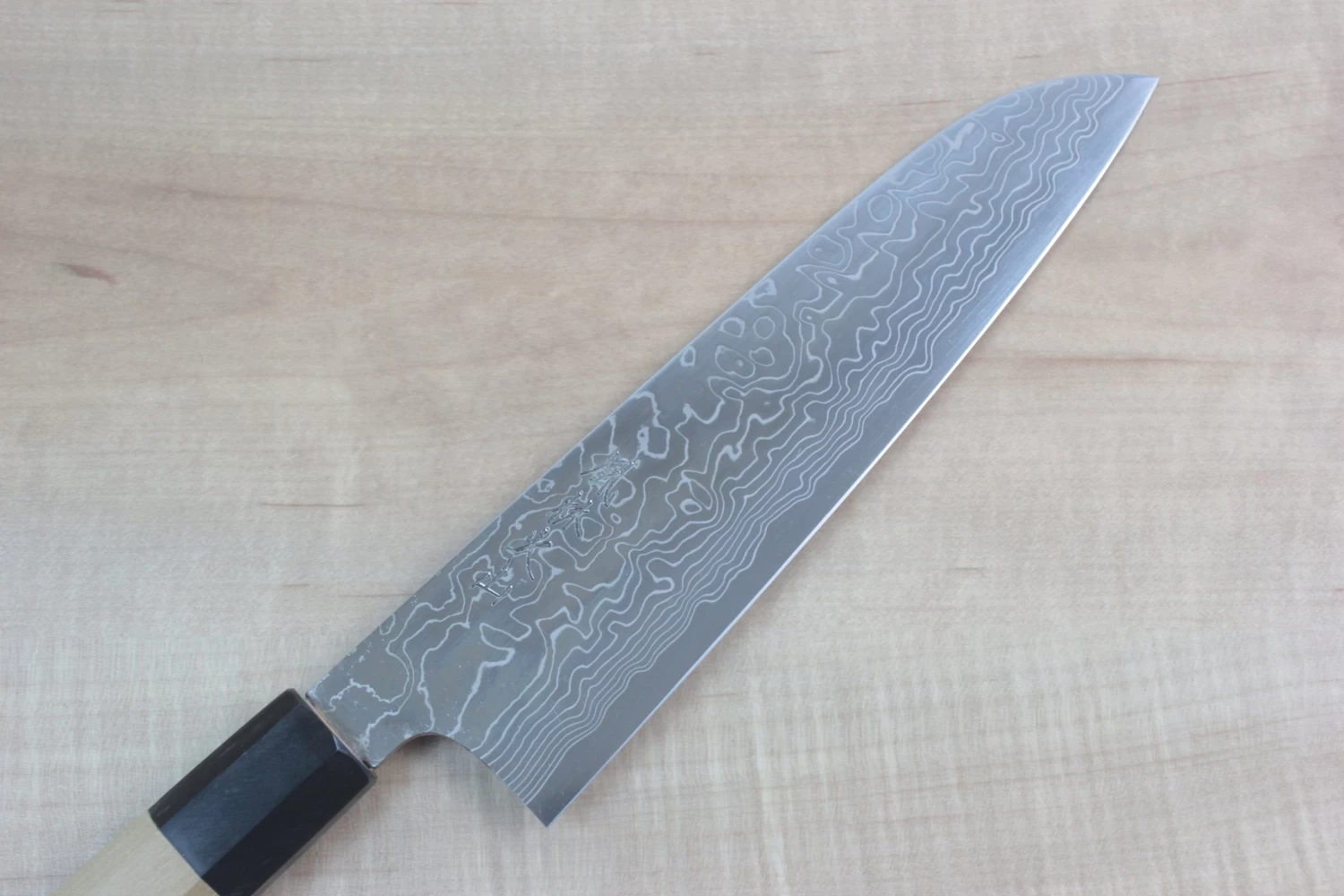 This beautiful Damascus Wa Santku is forged and hand crafted by passionate forge-smith Sukenari using R-2 steel. R-2 is high quality Powdered Metallurgy (P.M.) High Speed Tool Steel from Kobelco. R-2 has a very rich chemical composition, which includes Carbon 1.25-1.45 %, Chromium 14- 16%, Molybdenum 2.3- 3.3 %, and Vanadium 1.8- 2.2 %.