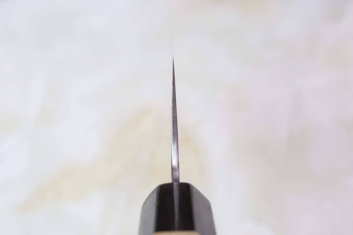 This knife has a comfortable octagonal magnolia wood handle, which has a buffalo horn ferrule. For safekeeping, this knife comes with a matching magnolia wood Saya (Sheath) with a black pakkawood Saya pin.