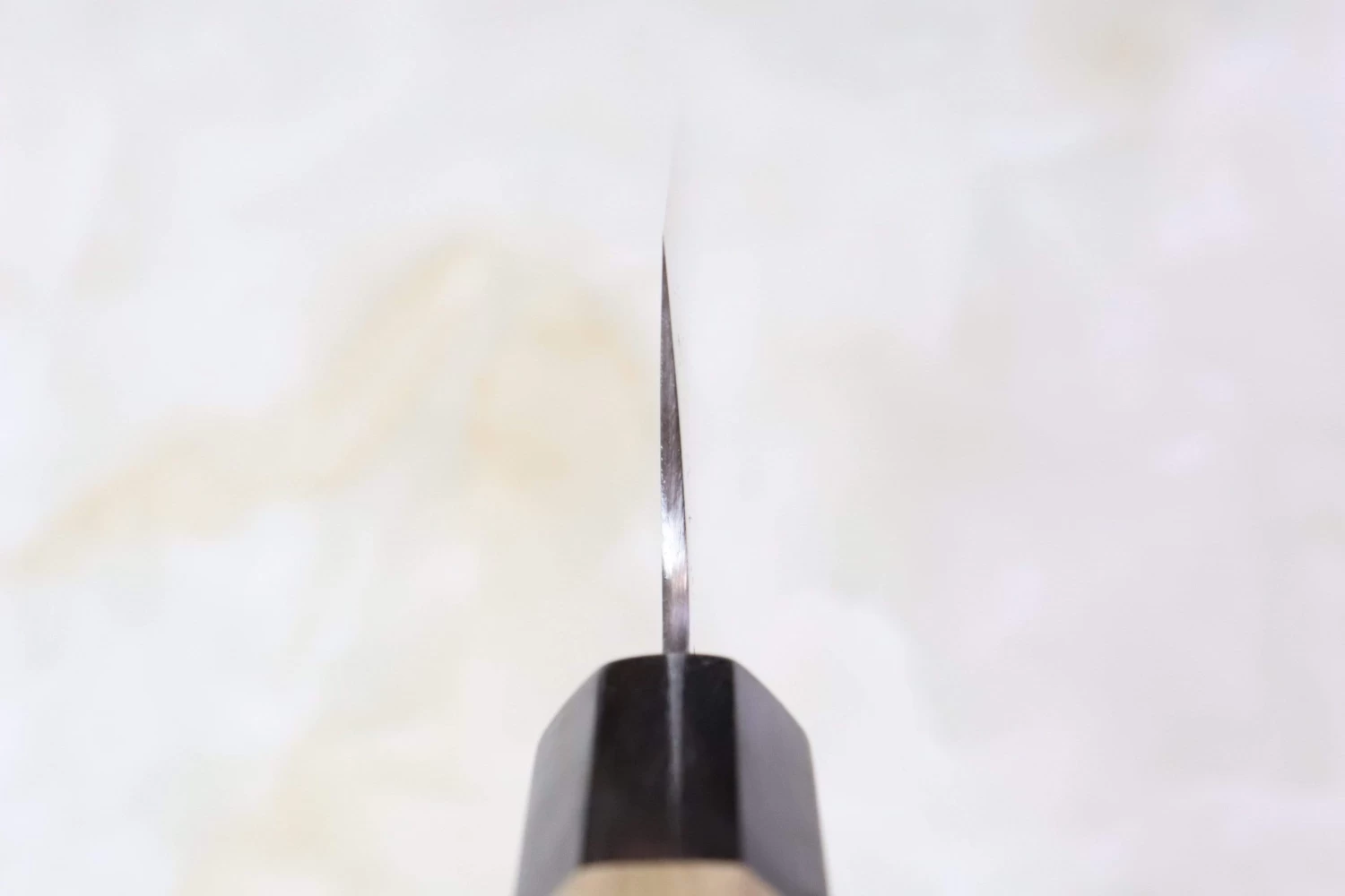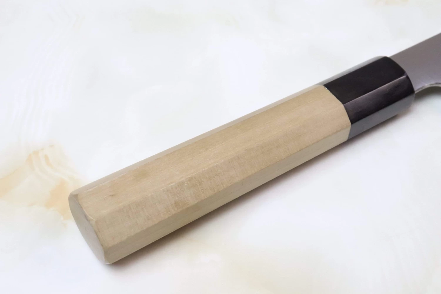 This knife has a comfortable octagonal magnolia wood handle, which has a buffalo horn ferrule. For safekeeping, this knife comes with a matching magnolia wood Saya (Sheath) with a black pakkawood Saya pin.