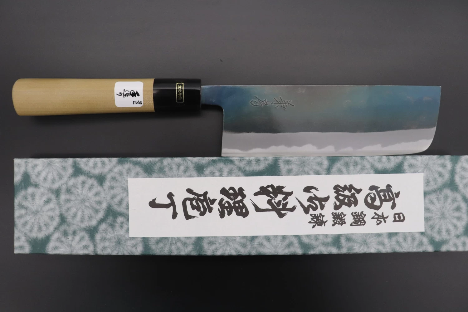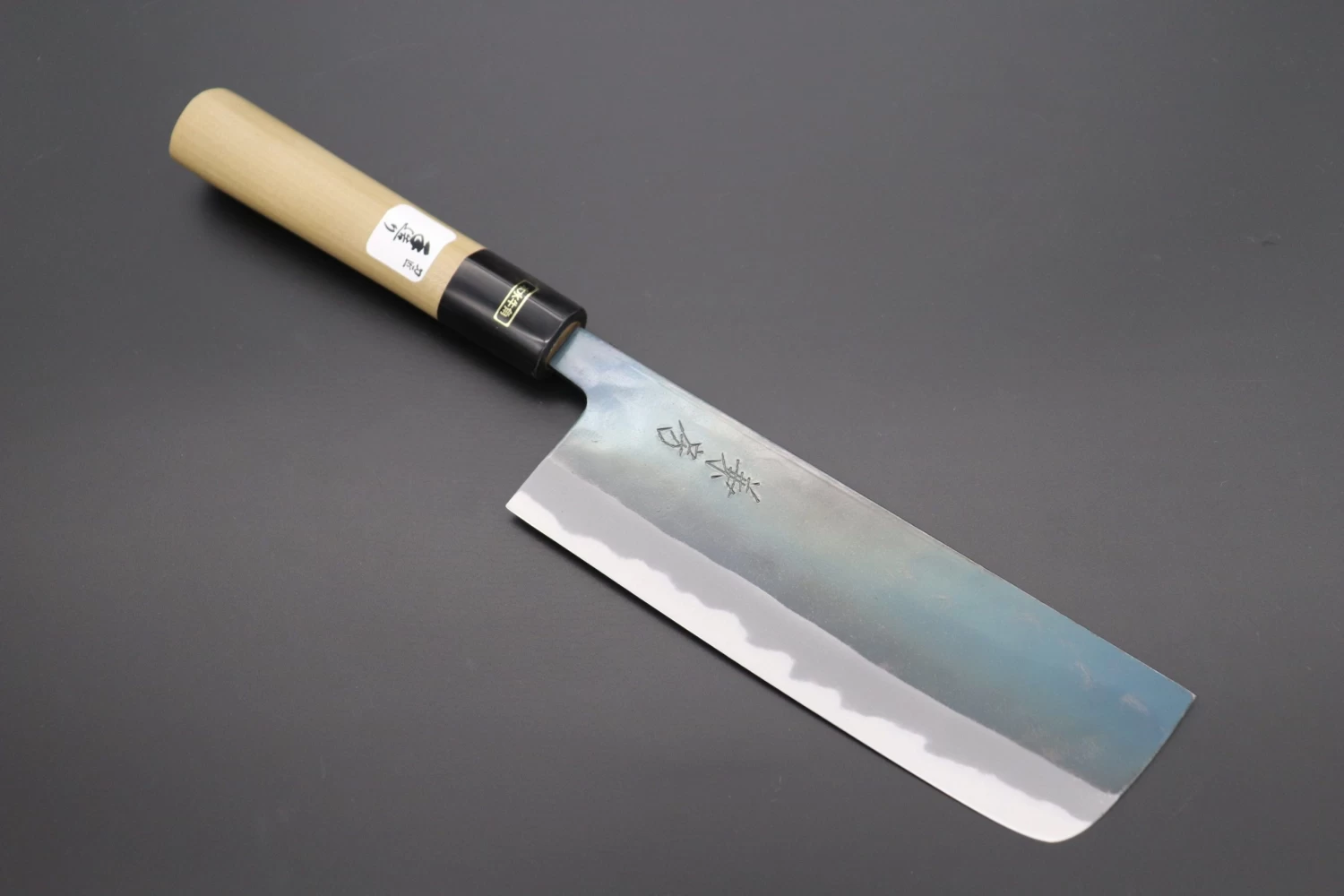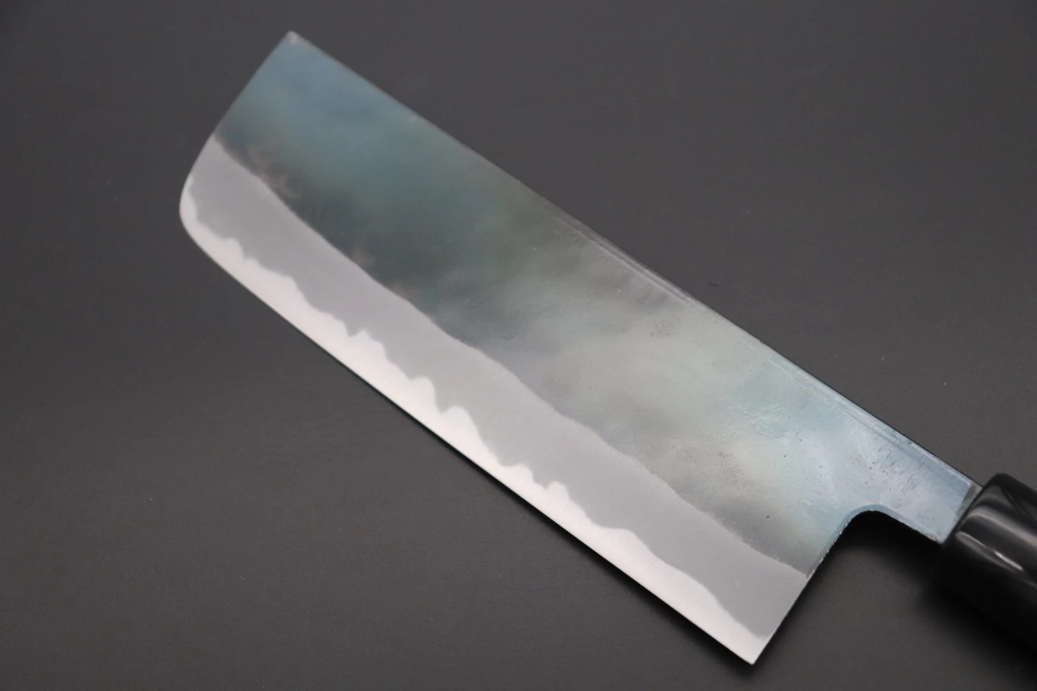 The Fujiwara Kanefusa Kurouchi Nakiri knife has unique “Black Forged” (Kurouchi) blade. The blade core is made from Hitachi White Steel No.2, which is sandwiched with soft iron.