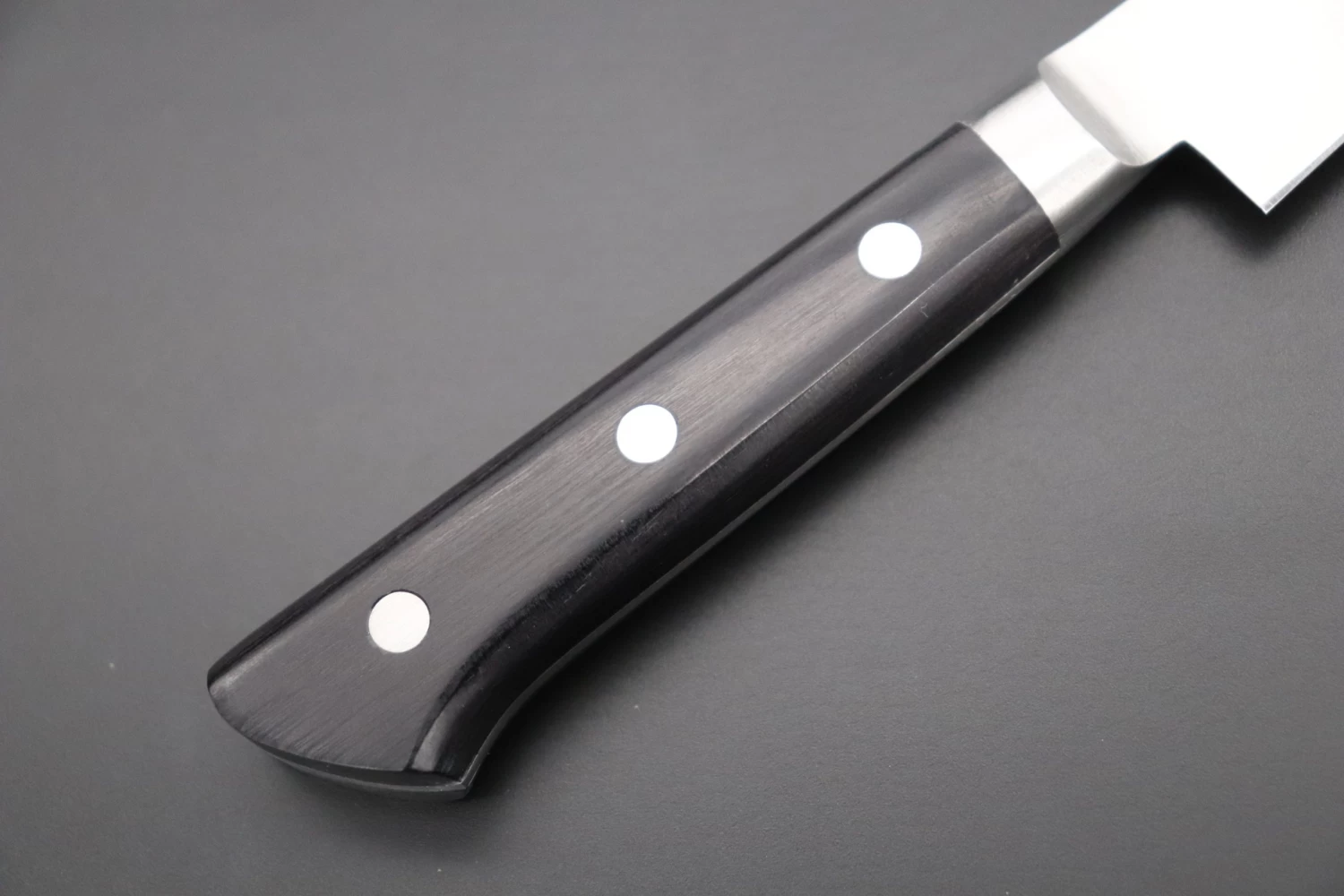 This knife has comfortable black pakkawood handles and a stainless steel bolster, which provides good blade balance and a fine grip.