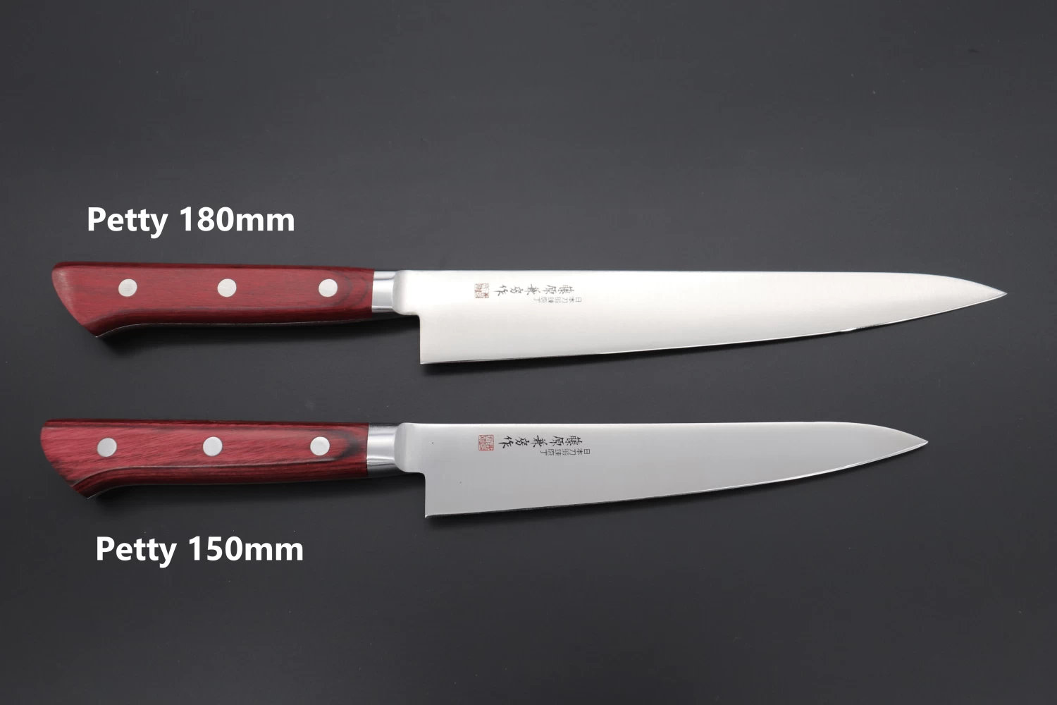 Petty 150mm (5.9″) Cutting edge length: 150mm Total Length: 265mm Blade Thickness: 1.8mm Blade Width: 28mm Handle Length: 110mm Total Weight: 97g |