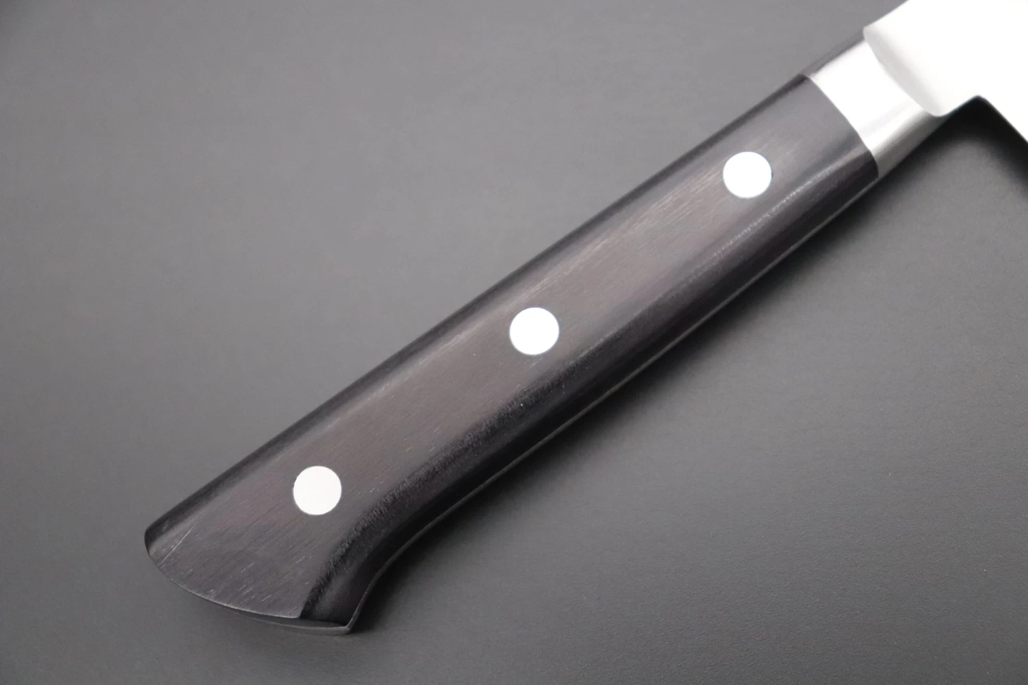 Fujiwara FKS knife also features the same comfortable black pakkawood handle and stainless steel bolster, which provides good blade balance and a fine grip.