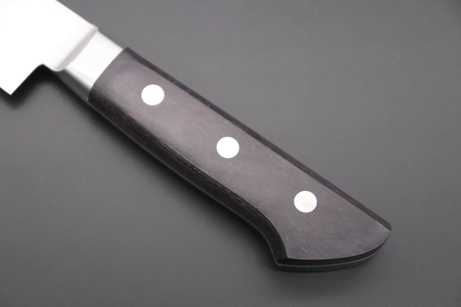 Fujiwara FKS knife also features the same comfortable black pakkawood handle and stainless steel bolster, which provides good blade balance and a fine grip.