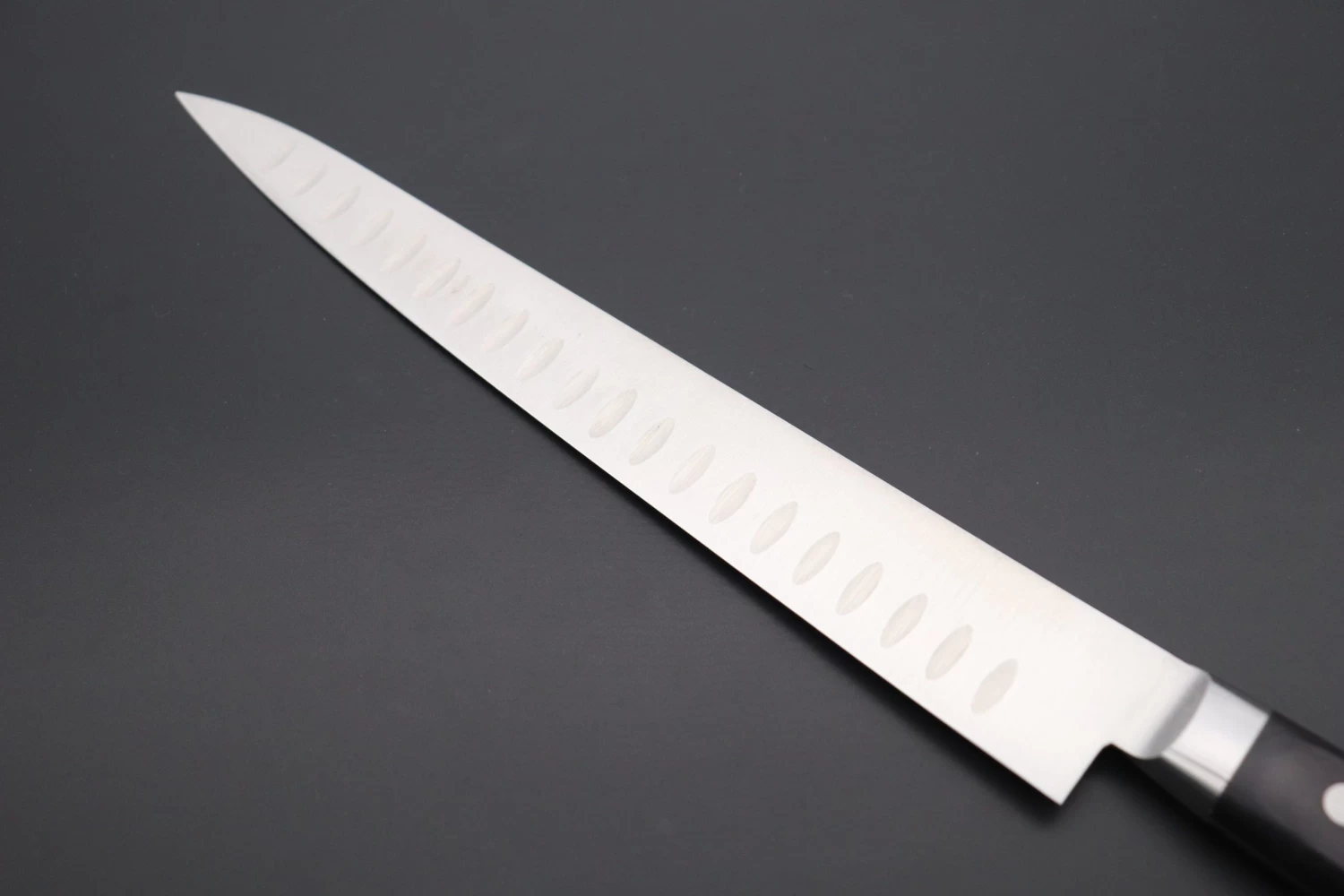 The unique feature of the FKS knives is the series of circular dimples that are ground in to thee blades. The dimples reduce the contact surface of the blade, which results in better cutting performance and help to prevent food from sticking to the blade. We also think that the dimples give the knife a more distinctive appearance than the FKM knives.