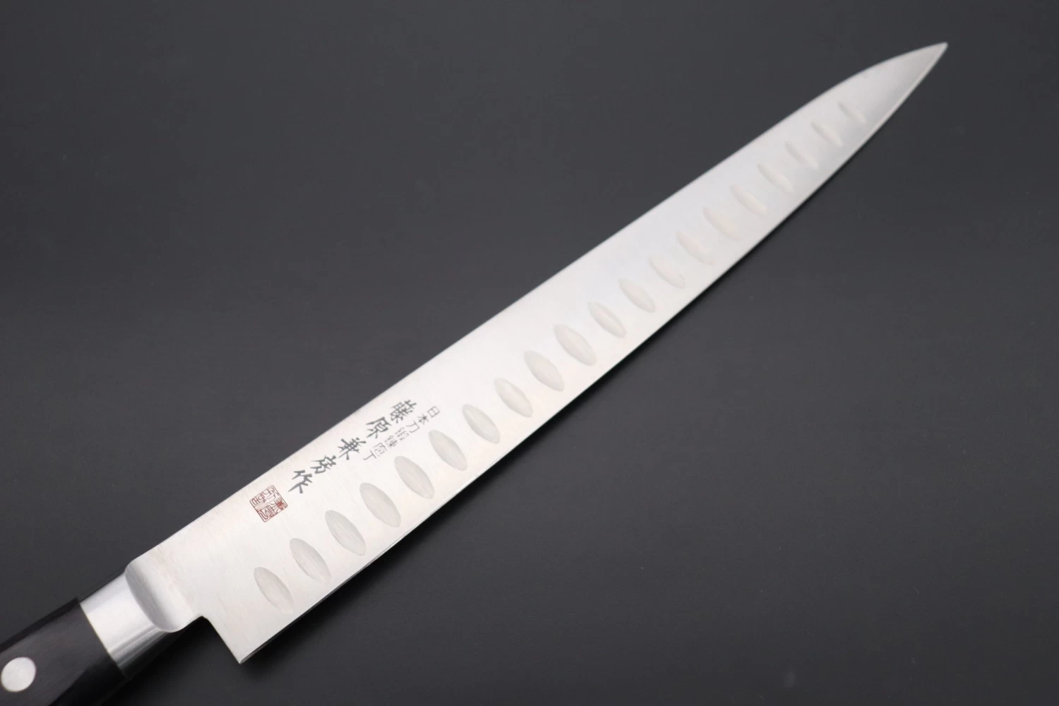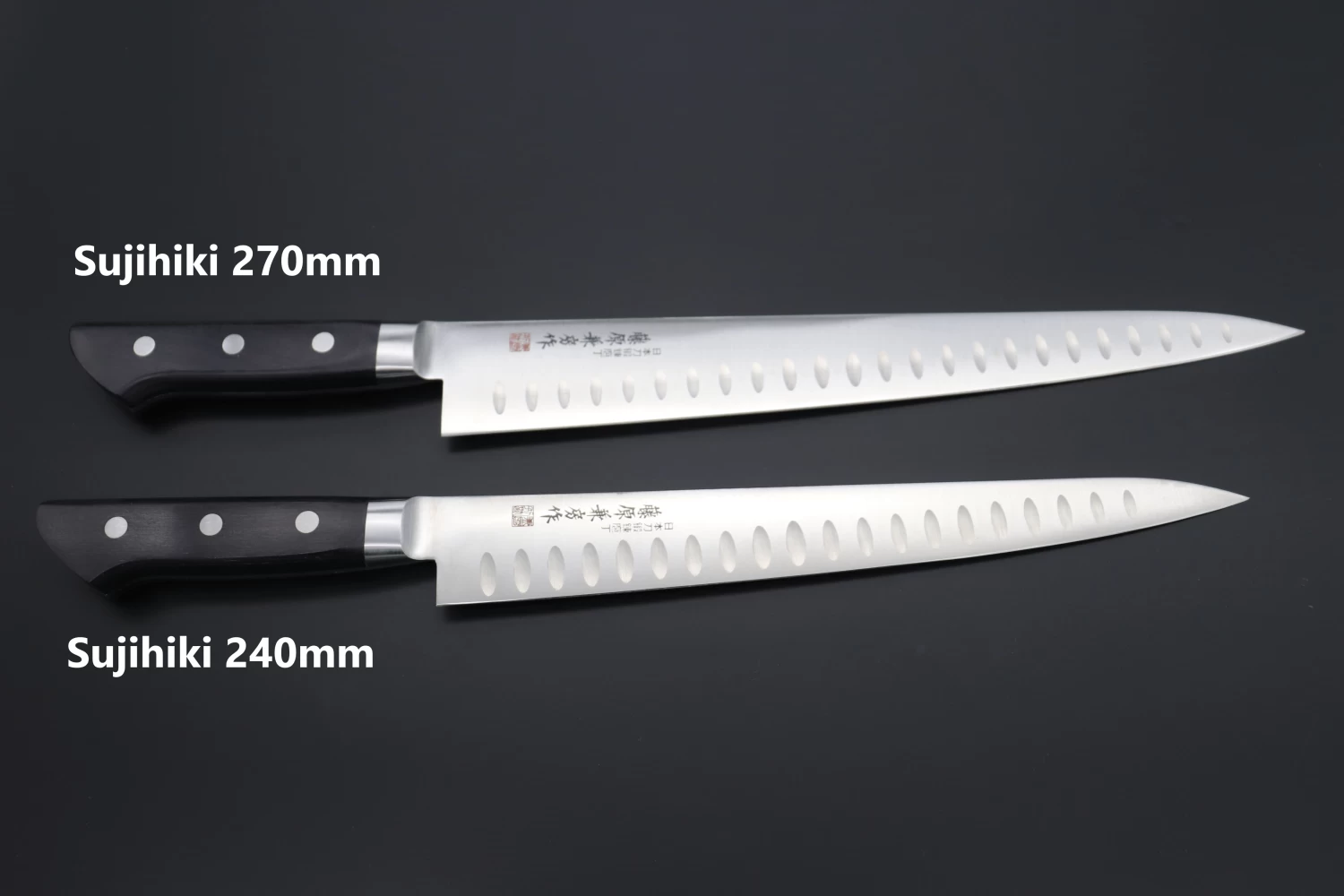 The long, narrow, graceful blade of the Sujihiki is particularly useful for trimming away sinew and fat from meat, finely slicing meat or boneless fish, or for filleting and skinning fish. The long blade allows the meat or fish to be cut in one single drawing motion, from heel to tip.