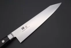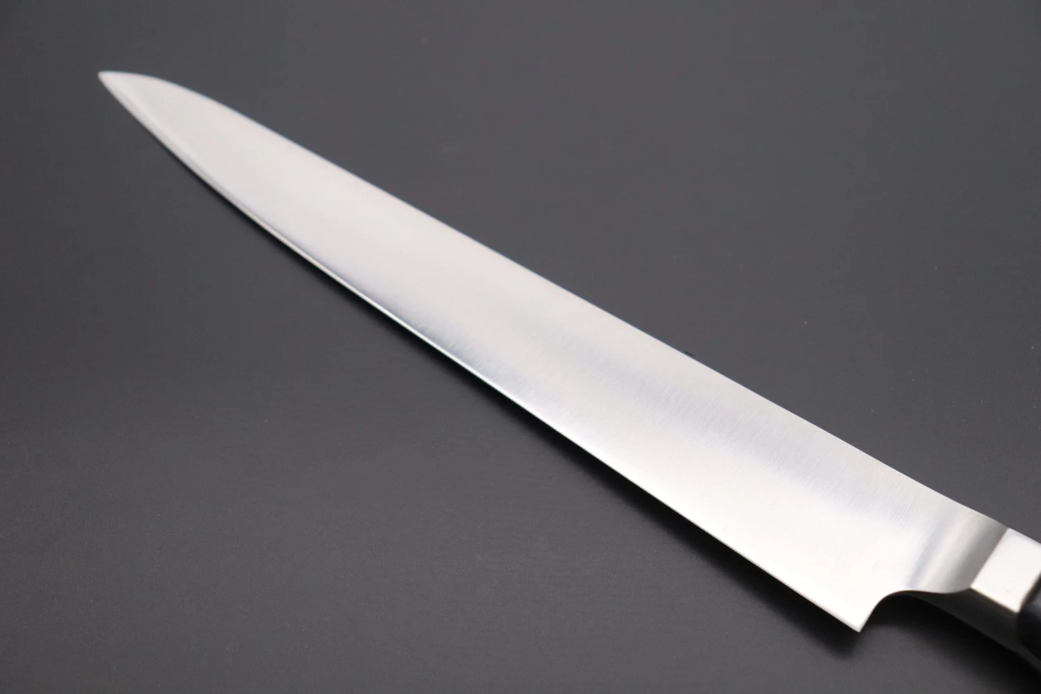 The long, narrow, graceful blade of the Sujihiki is particularly useful for trimming away sinew and fat from meat, finely slicing meat or boneless fish, or for filleting and skinning fish. The long blade allows the meat or fish to be cut in one single drawing motion, from heel to tip.