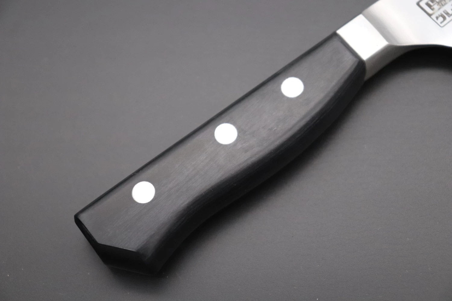 This knife has comfortable black pakka wood handle and a stainless steel bolster, which provides good blade balance and a fine grip.