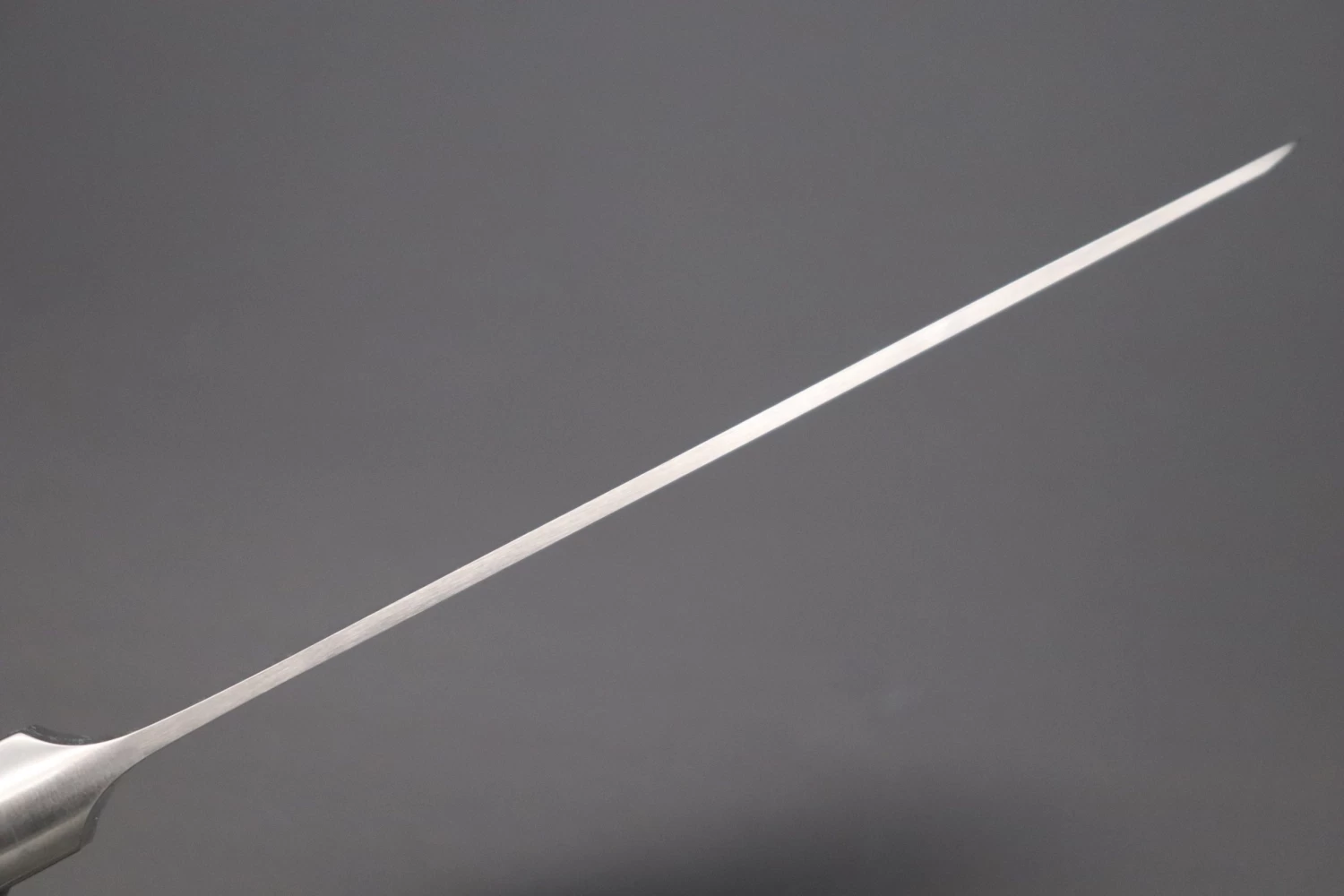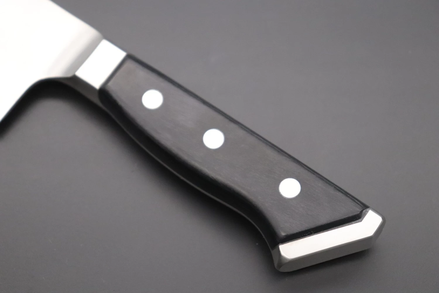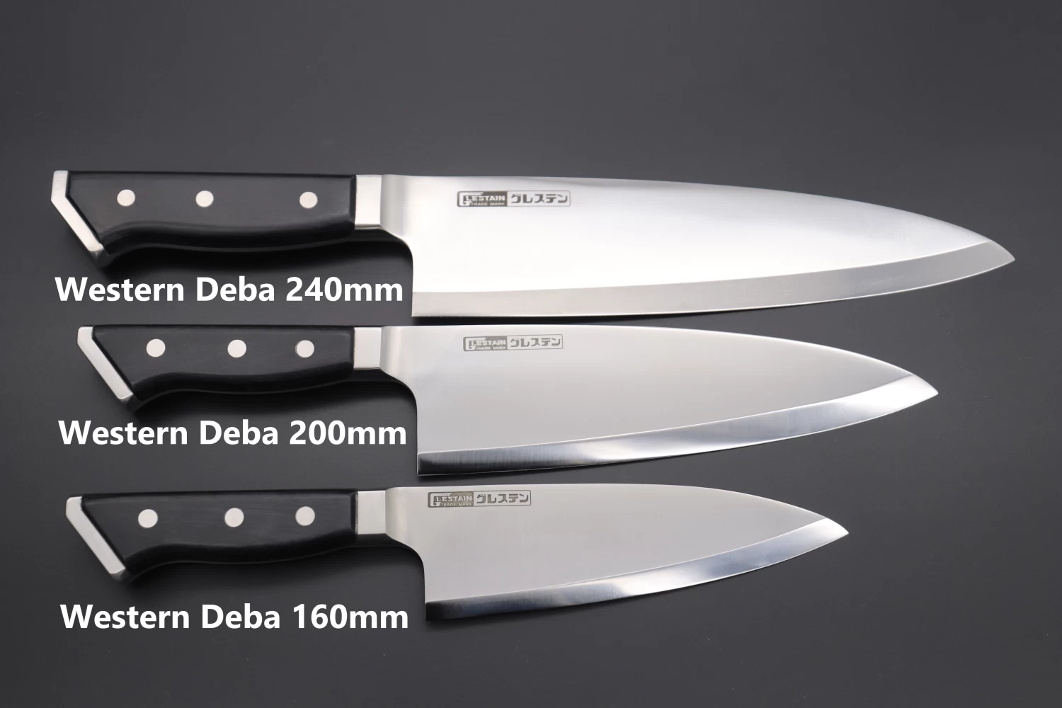 The ‘Western Deba’ is essentially a Western-styled variation of the traditional Japanese Deba knife that has a double bevel edge. It has a thick, heavy, and durable blade that is specially designed for the butchery of poultry, fish, and crustaceans such as shrimp, lobster, and crab – tasks that are not suited to the relatively thin blades of most Japanese knives. The heel portion of the Western Deba is capable of cutting through the small bones and cartilage of poultry and, when used with the correct technique, can safely be used to remove and split open the legs and claws of crabs.
