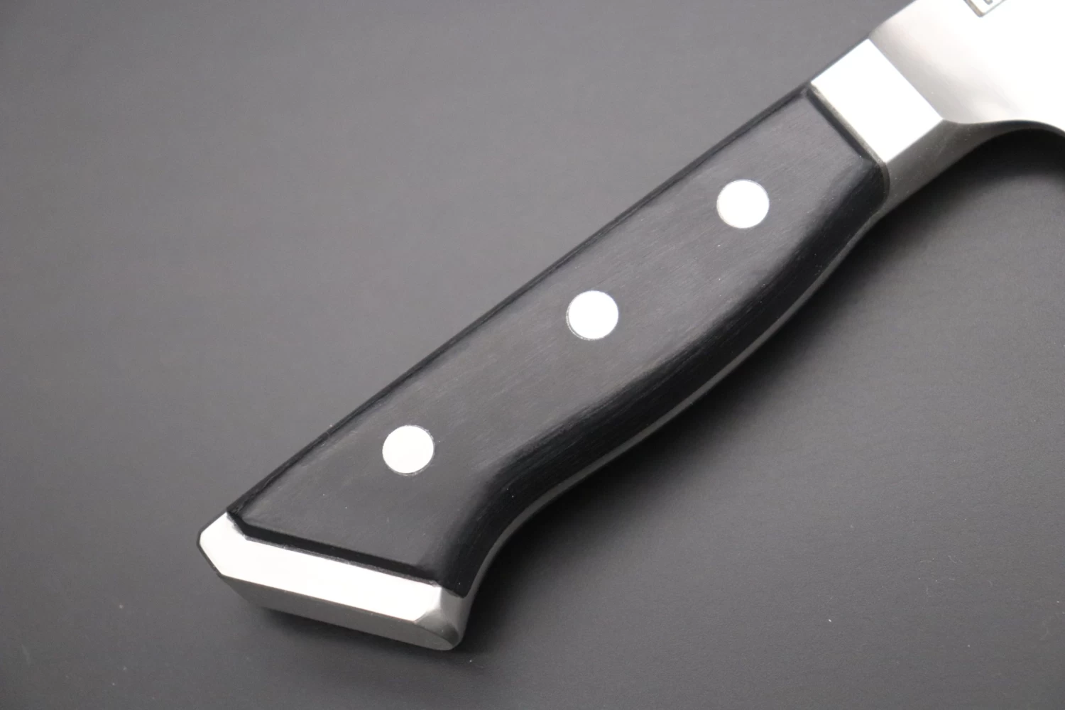 This knife has comfortable black pakka wood handle and a stainless steel bolster, which provides good blade balance and a fine grip.