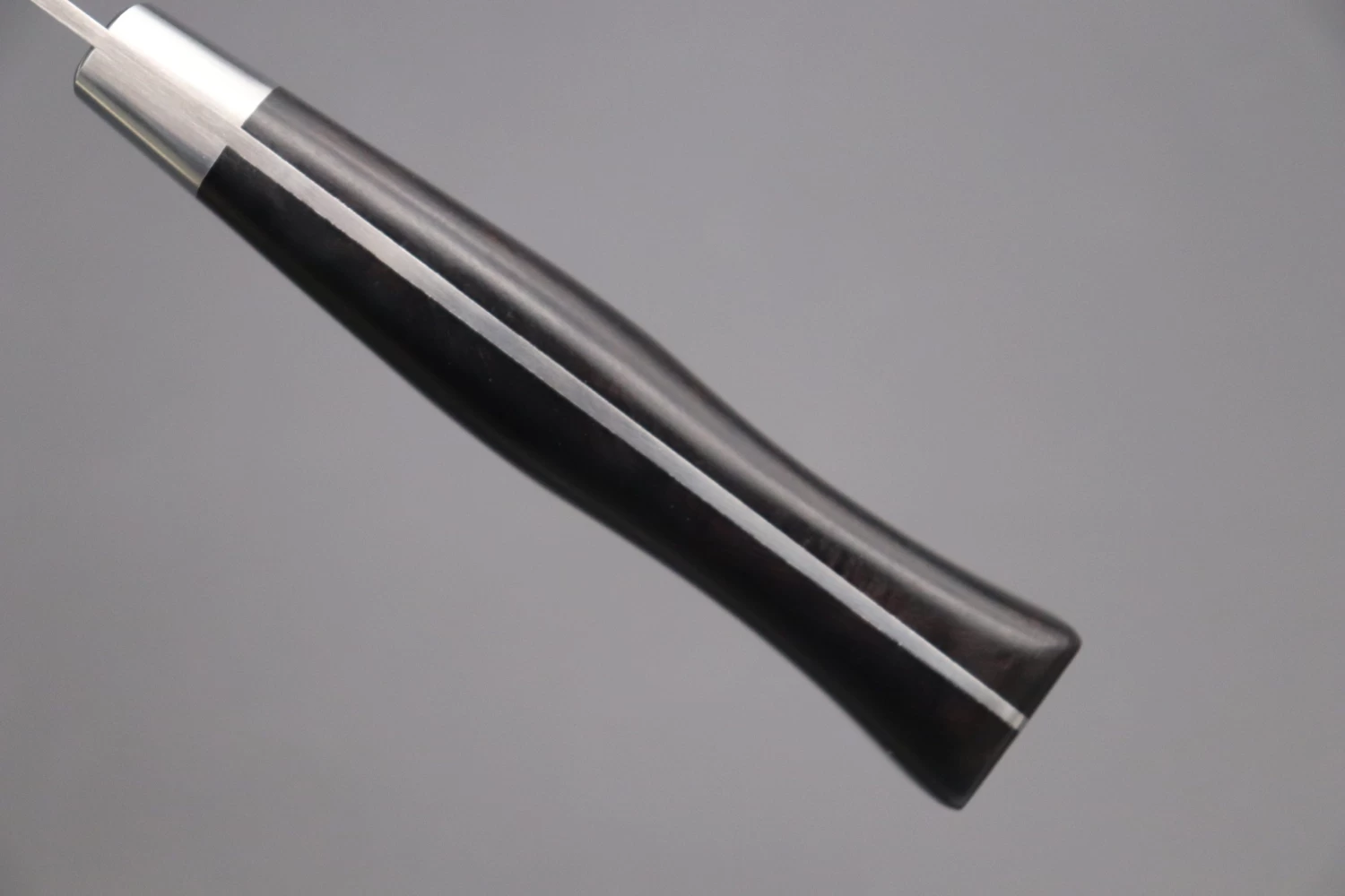 For the handle material, Master Hattori chose the African Black wood which has an elegant look of dark & simple textures. Hattori’s fine custom hand working process can be seen on its well hand contoured and perfect shaped handle.