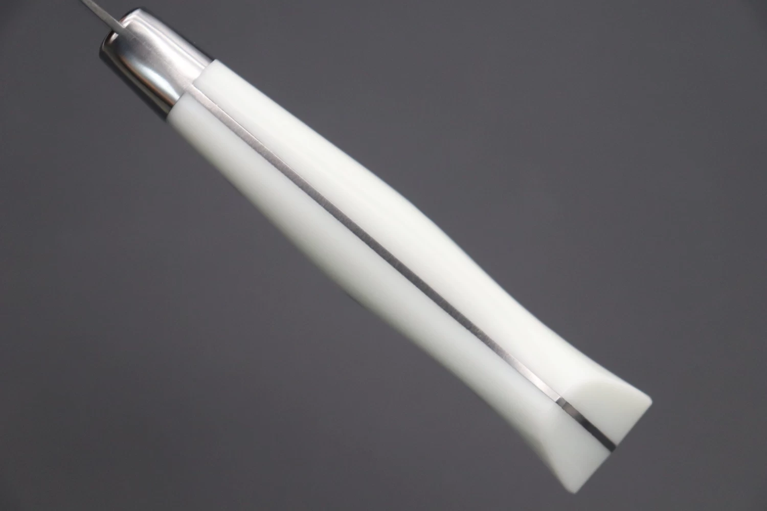 Nicely hand contoured DuPont Corian Handle has light coloring mixed stylish texture and coloring. DuPont Corian is the special material which is invented and produced for high-end, luxury kitchen, kitchen counters and tables, etc. They are equally beautiful to Natural Marble Stone, yet have great durability, non-shrinkage and sanitary.