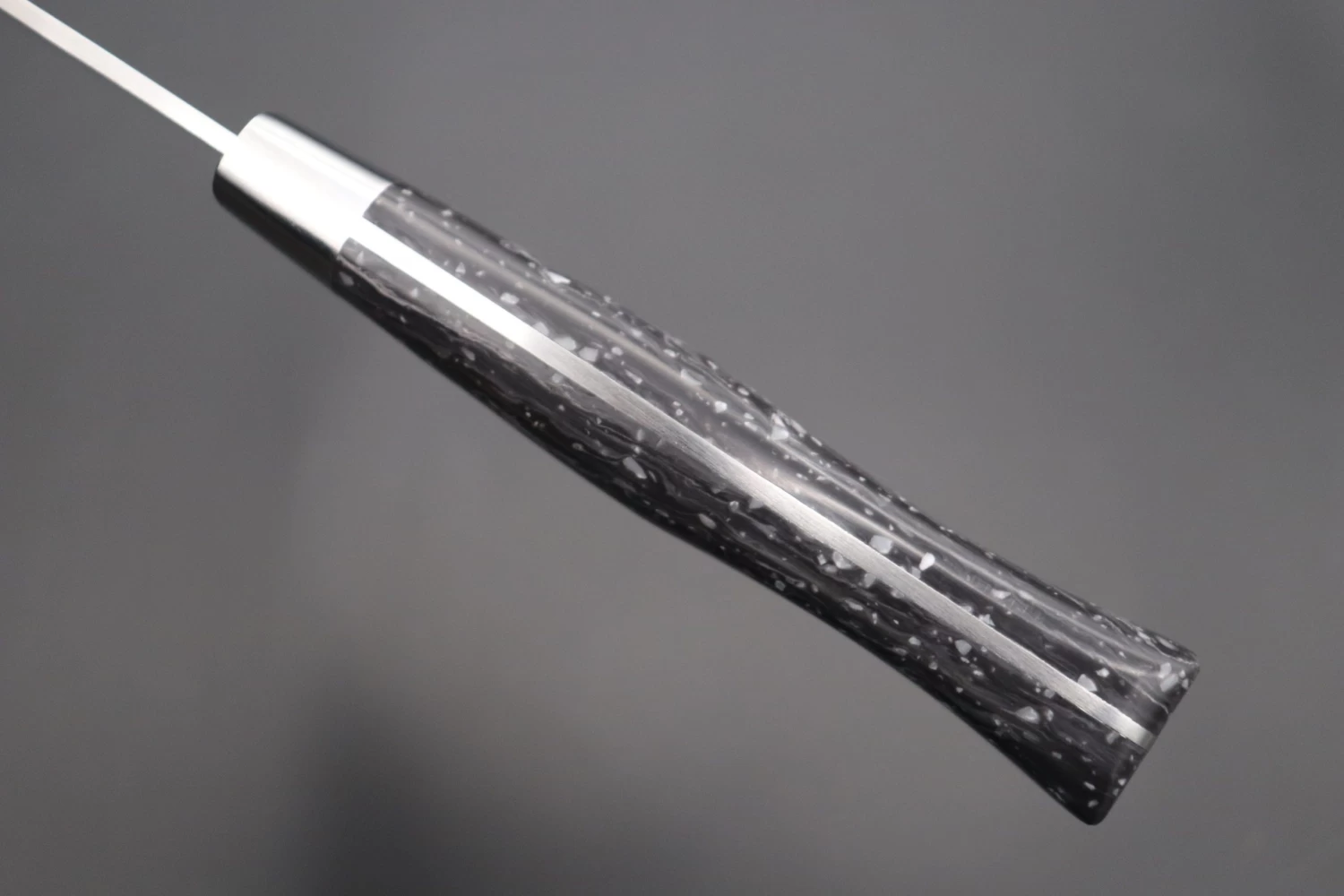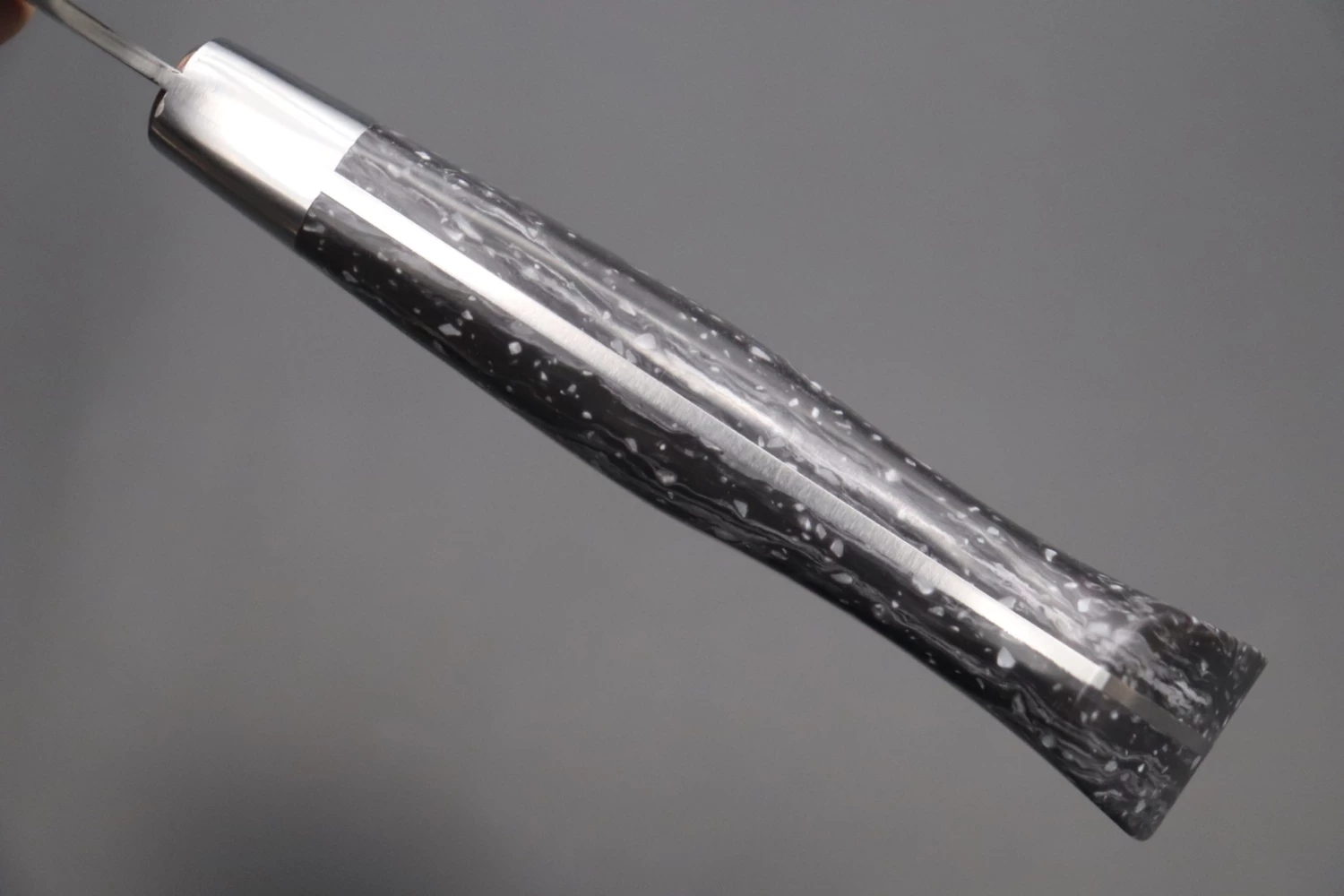 Master Hattori has used a new type of DuPont™ Corian® for the handle scales of these knives. It has a unique, beautiful appearance that reminded us of a similarly beautiful wintertime experience, hence the name “SNOW IN THE DARK”.