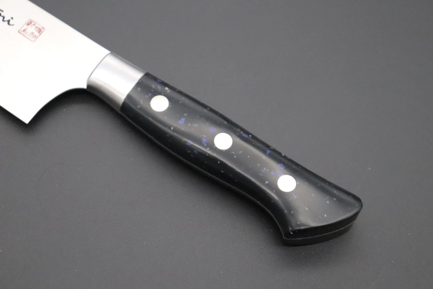 Master Hattori has used a new type of DuPont™ Corian®, called “Black Space”, for the handle scales of these knives. It has a unique, beautiful appearance that reminds us of stars and asteroids in the blackness of space.