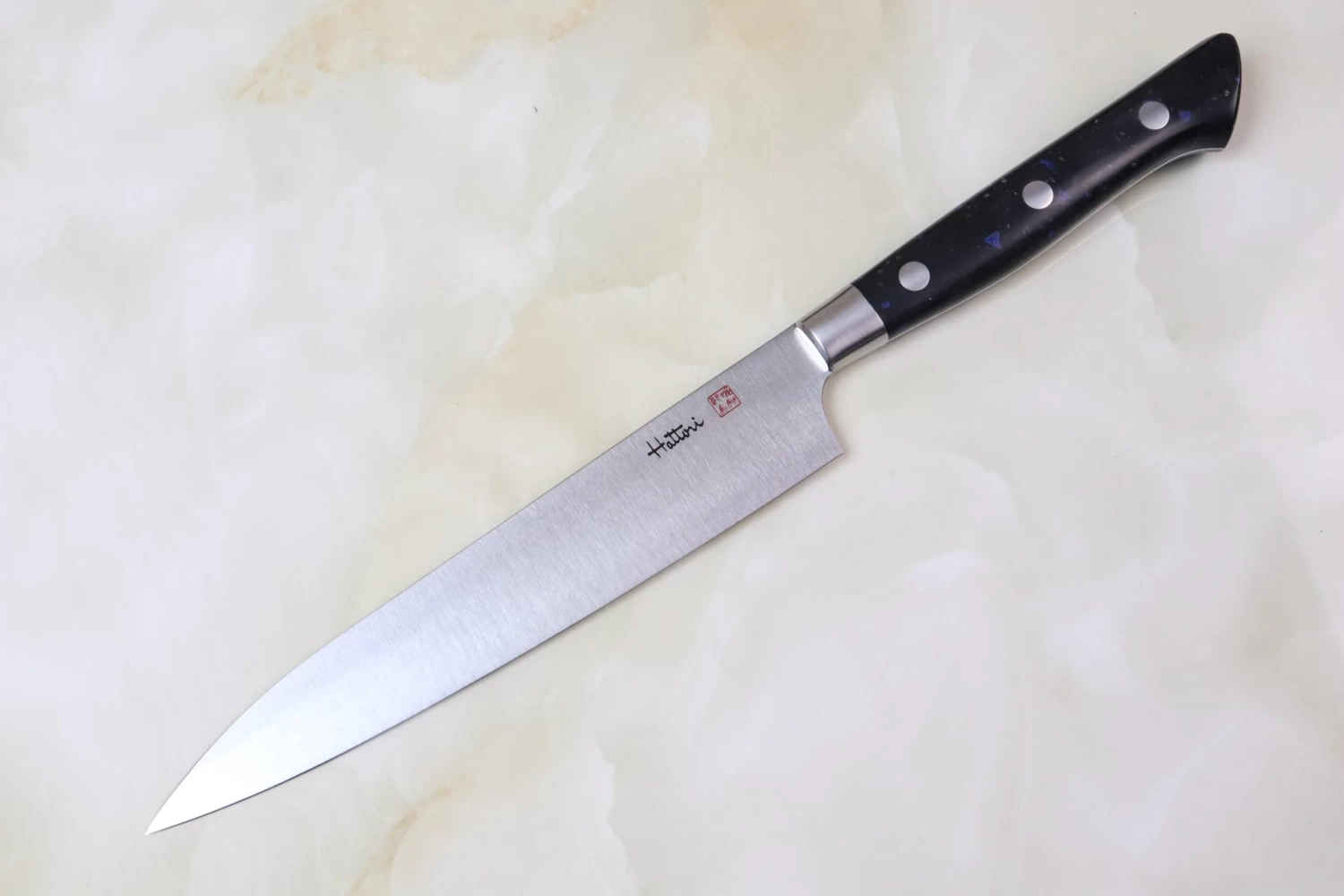A mainstay of professional Western kitchens, the Petty knife is a small general-purpose knife used for peeling, shaping, and slicing fruits and vegetables, chopping herbs, and making garnishes. The compact size and relatively narrow blade of the Petty knife mean that it is very nimble and controllable, thus it is ideal for making precise cuts.