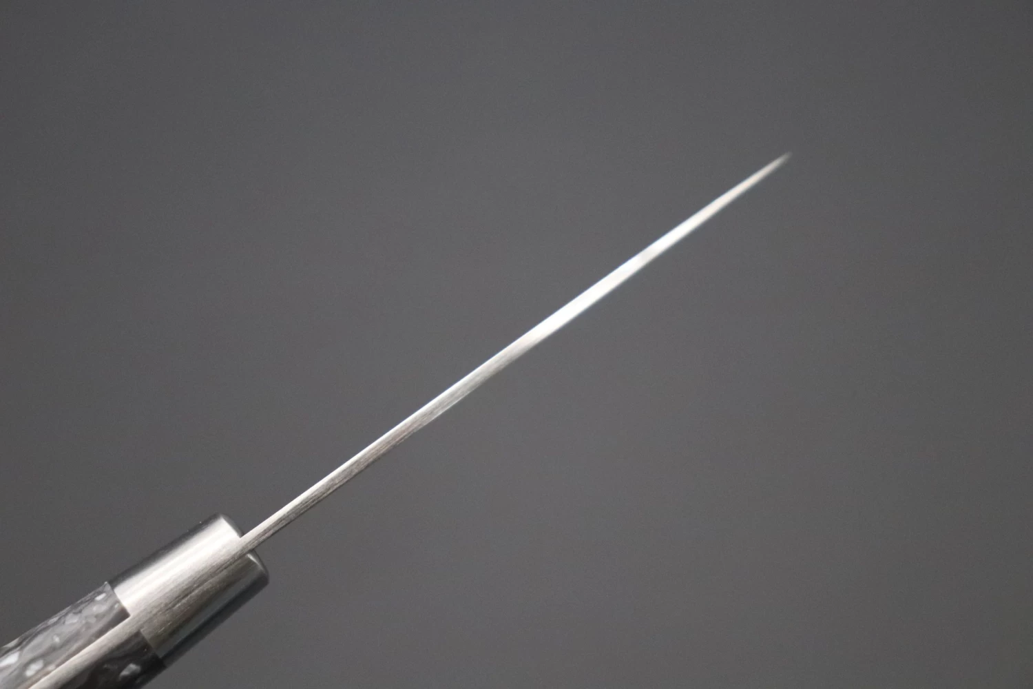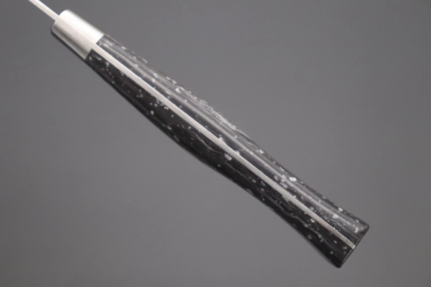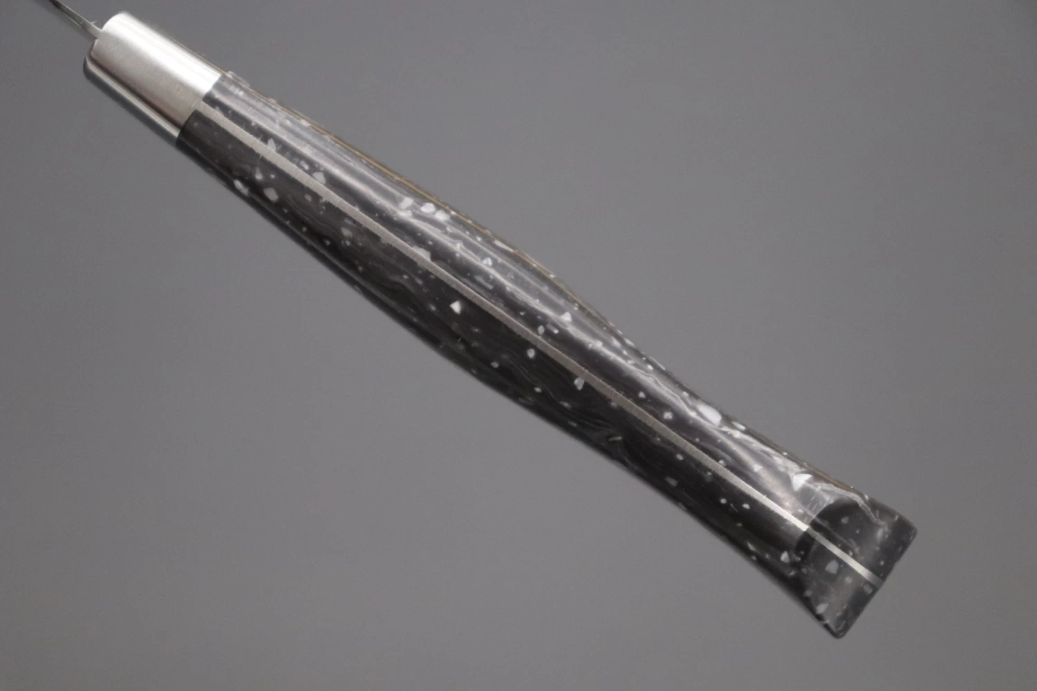 Master Hattori has used a new type of DuPont™ Corian® for the handle scales of these knives. It has a unique, beautiful appearance that reminded us of a similarly beautiful wintertime experience, hence the name “SNOW IN THE DARK”.