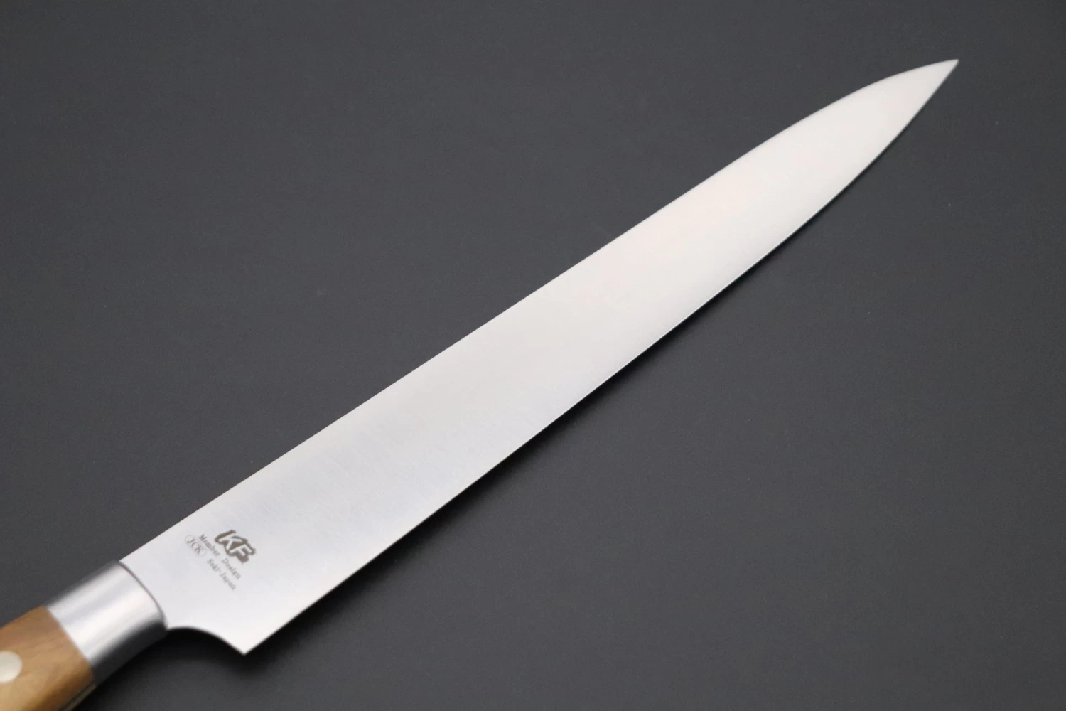 The long, narrow, graceful blade of the Sujihiki is particularly useful for trimming away sinew and fat from meat, finely slicing meat or boneless fish, or for filleting and skinning fish. The long blade allows the meat or fish to be cut in one single drawing motion, from heel to tip.