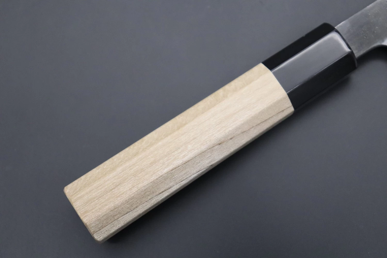 Although some people consider Master Honoura’s knives to be thick and heavy, their geometry is the result of carefully considering every aspect of their function. Contrary to what you might expect, the process of forging a thick blade ‘to shape’ actually requires a lot of time and skill. Master Honoura’s knives are nicely tapered from their heel to the tip and from their spine down to the cutting edge, which is ground very thin behind the edge. We are confident that these knives will provide the high cutting performance that is demanded by Carbon steel lovers!