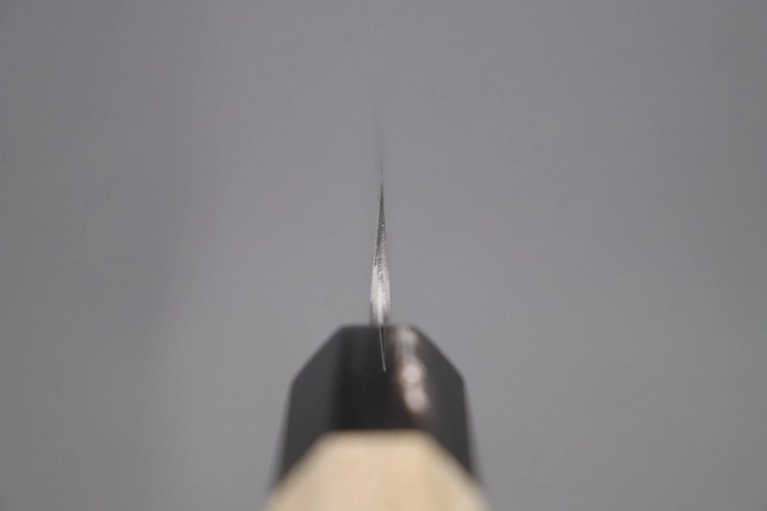We requested that Hinoura uses White Steel No.1 for the core blade steel. It is sandwiched with outer layers of soft stainless steel. The laminated construction means that only the high-carbon steel blade core is likely to discolor or rust, since the outer layers of soft stainless steel are corrosion-resistant and easy to maintain. The layers of soft stainless steel also improve the blade’s resistance to impact and bending forces. White Steel No.1 is made by further refining White Steel No.2 and adding more Carbon. The extra Carbon allows it to achieve a slightly higher HRc. than White Steel No.2. It can be sharpened to an exceedingly fine edge, has very good edge retention and is easy to re-sharpen.