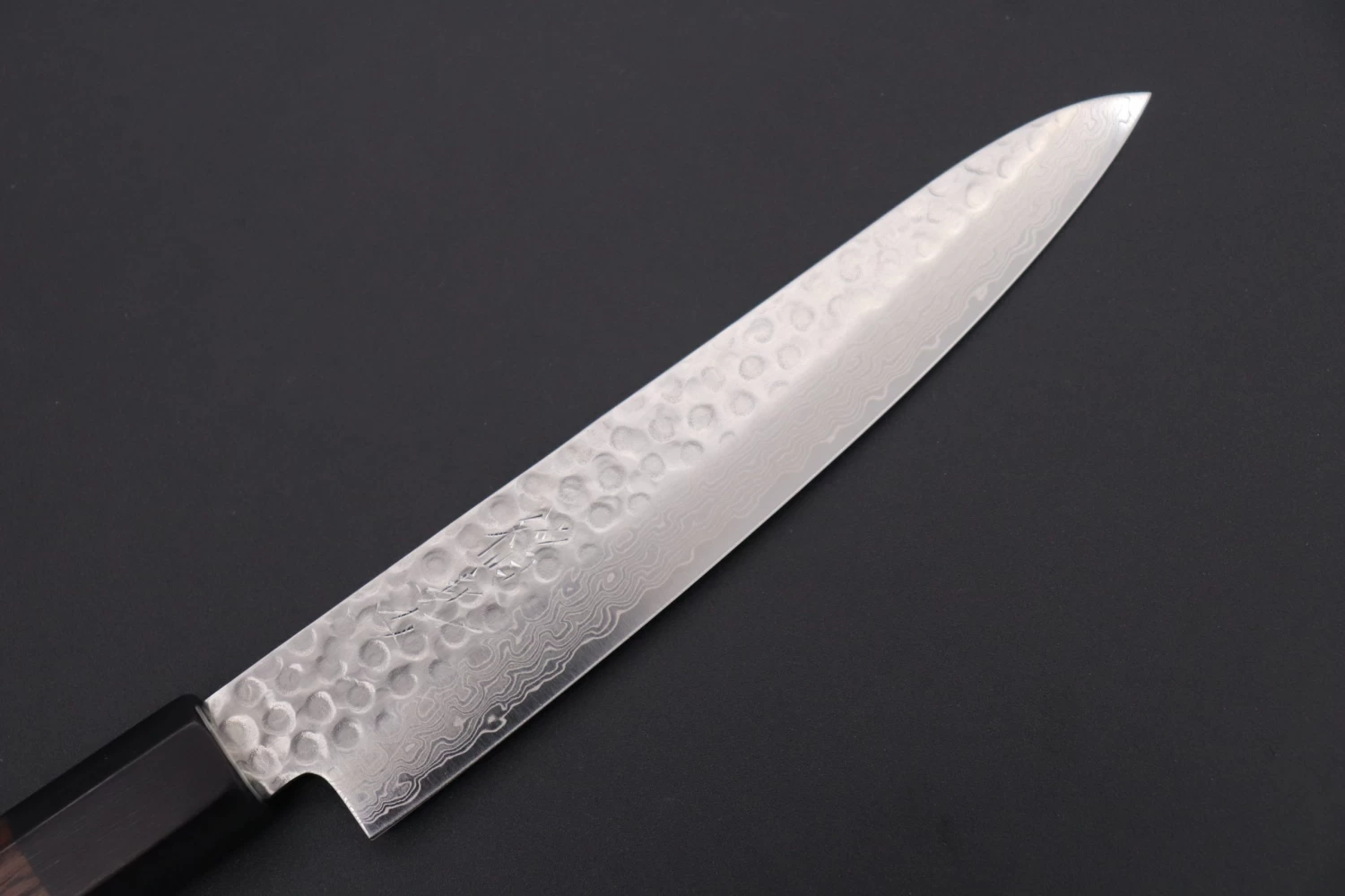 Inazuma knife has a unique & beautiful Tsuchime (“Hammered pattern”) textured Damascus blade. This knifefeatures a hand sharpened and hand honed AUS-10 Nickel Damascus stainless steel blade (HRc. 60-61. 50/50 symmetrically ground double beveled edge).
