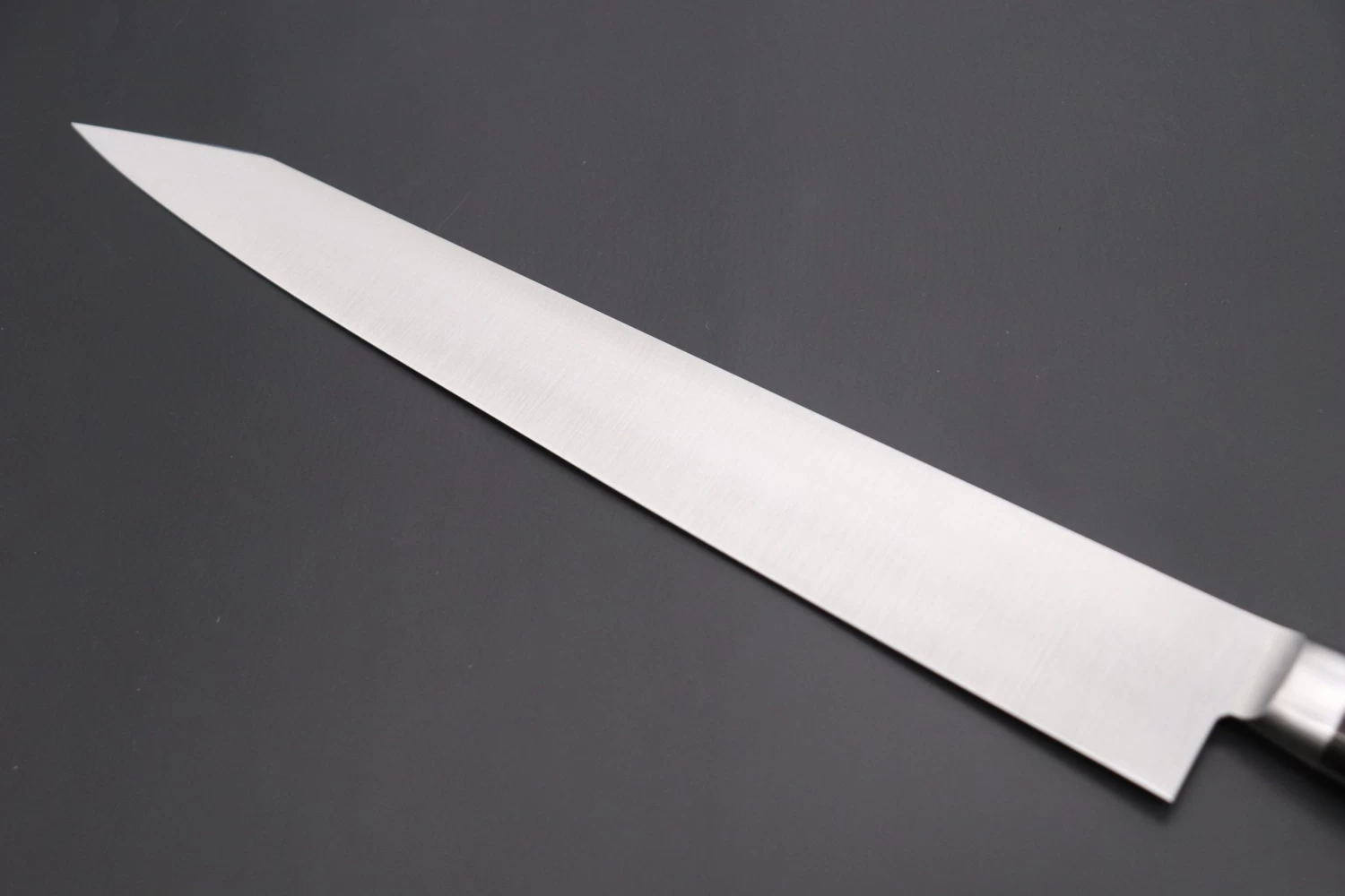 The long, narrow, graceful blade of the Kiritsuke-Sujihiki is particularly useful for trimming away sinew and fat from meat, finely slicing meat or boneless fish, or for filleting and skinning fish. The long blade allows the meat or fish to be cut in one single drawing motion, from heel to tip.