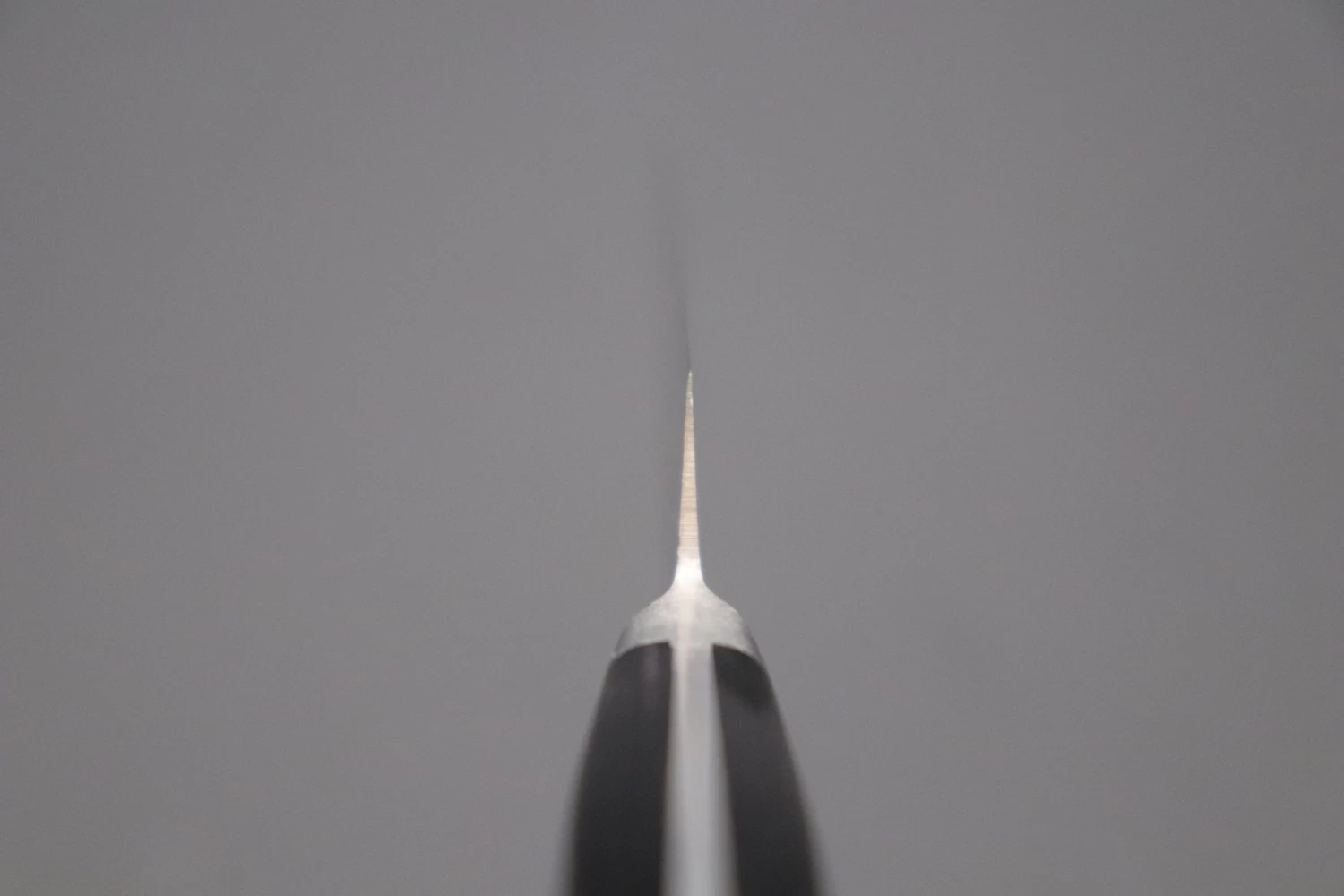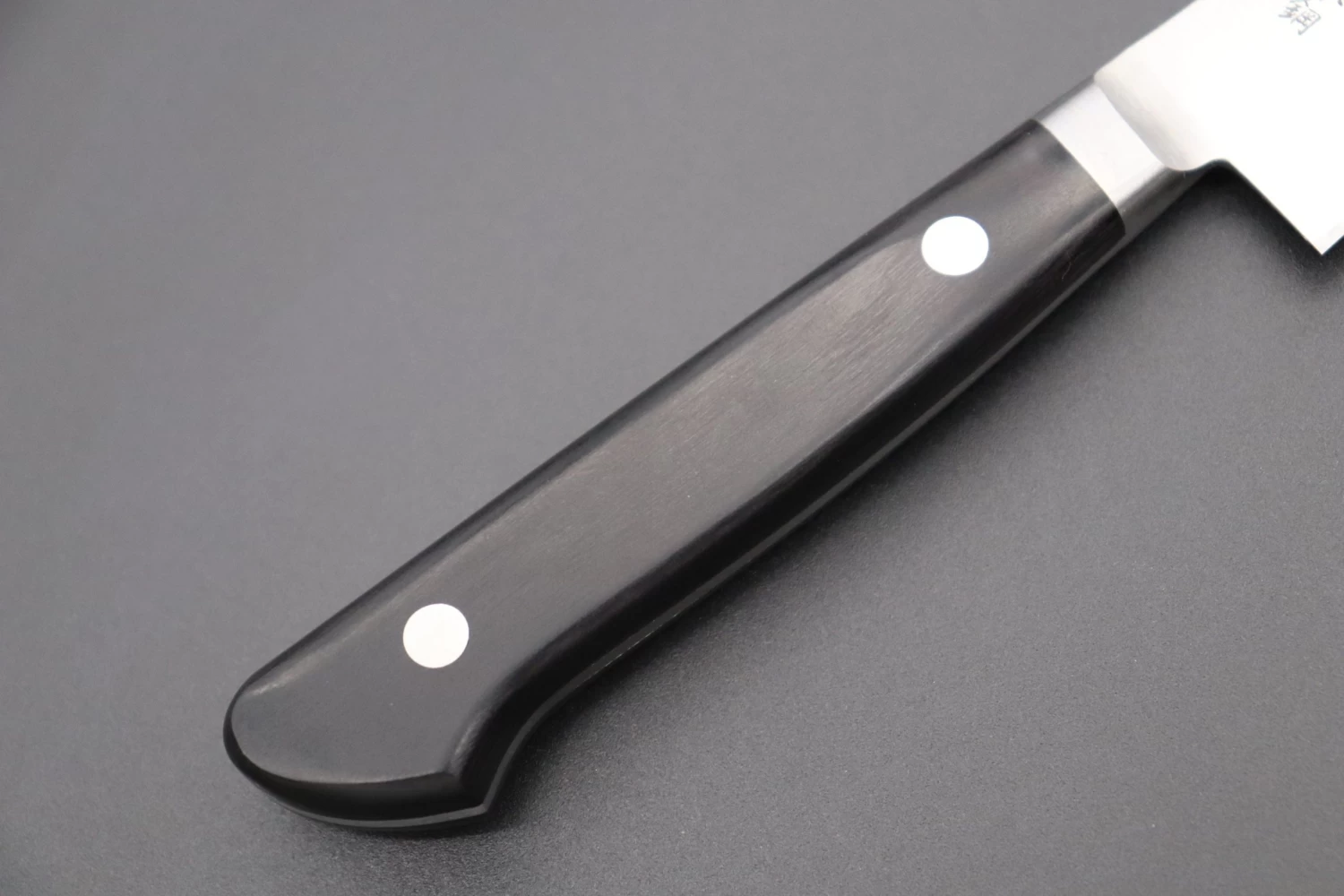 The blade is made of solid CarboNext special high carbon tool steel that is hardened to HRc. 59-61. The knife features superb fit and finish, full tang construction, and comfortable black pakkawood handles. Its thin blade has a slow gradual taper and is finely ground, which results in excellent cutting performance and blade balance.