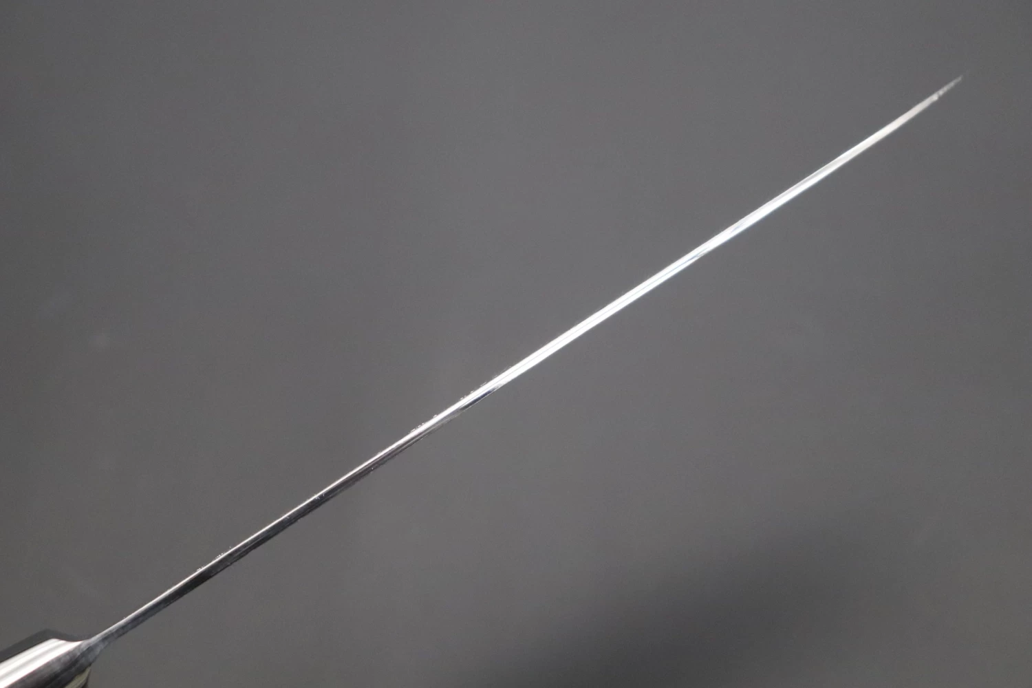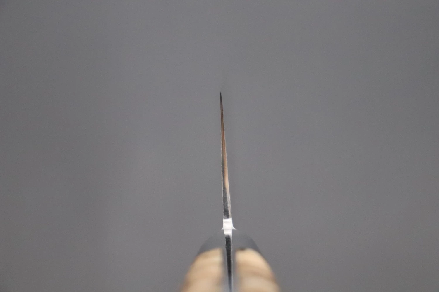 In order to satisfy new market demands, including those of a large number of experienced users and knife enthusiasts, Master Gotou has been refining his techniques for making a new generation of special steel knives. Master Gotou selected a special Powdered Metallurgy High Speed Tool Steel called “R-2”, which he heat treats to HRc. 63. R-2 is produced by a highly reputable Japanese company called Kobelco and offers remarkable cutting performance and edge retention.