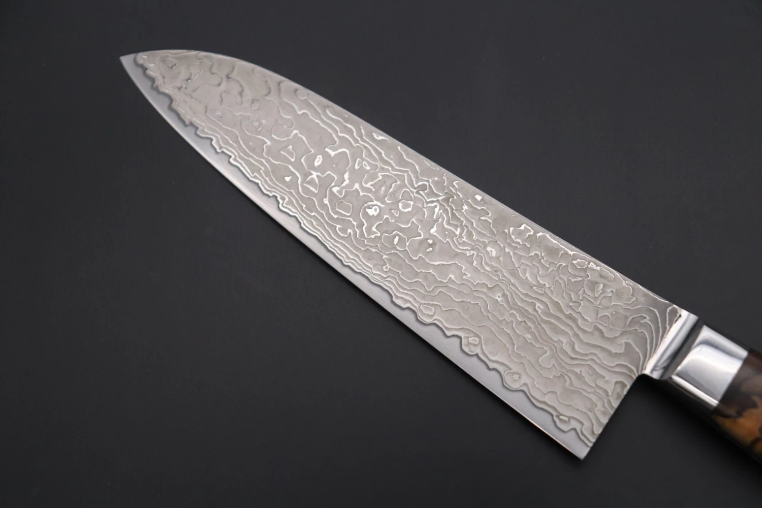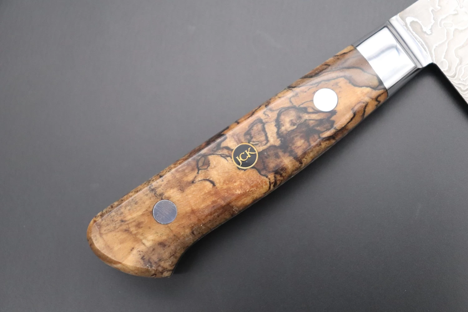 KAGAYAKI NOVEL R-2 Custom Damascus KNLTD-126 Santoku 175mm Knife comes with a Beautiful Natural Wood Grain texture, Custom Handmade Stabilized Spalted Wood handle, that is carefully hand countered and polished to ensure a comfortable&secure grip and beautiful appearance. Each knife is supplied with a matching wooden Saya (Sheath), which has been finished with a decorative black lacquer that complements the appearance of the Dark Damascus blade very well.