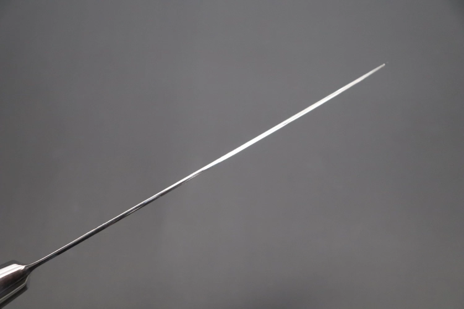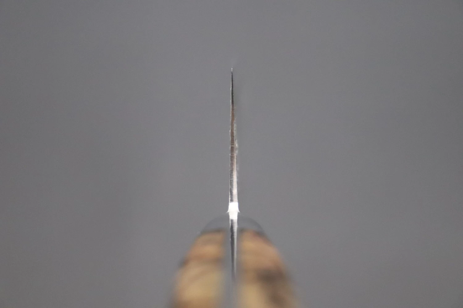In order to satisfy new market demands, including those of a large number of experienced users and knife enthusiasts, Master Gotou has been refining his techniques for making a new generation of special steel knives. Master Gotou selected a special Powdered Metallurgy High Speed Tool Steel called “R-2”, which he heat treats to HRc. 63. R-2 is produced by a highly reputable Japanese company called Kobelco and offers remarkable cutting performance and edge retention.