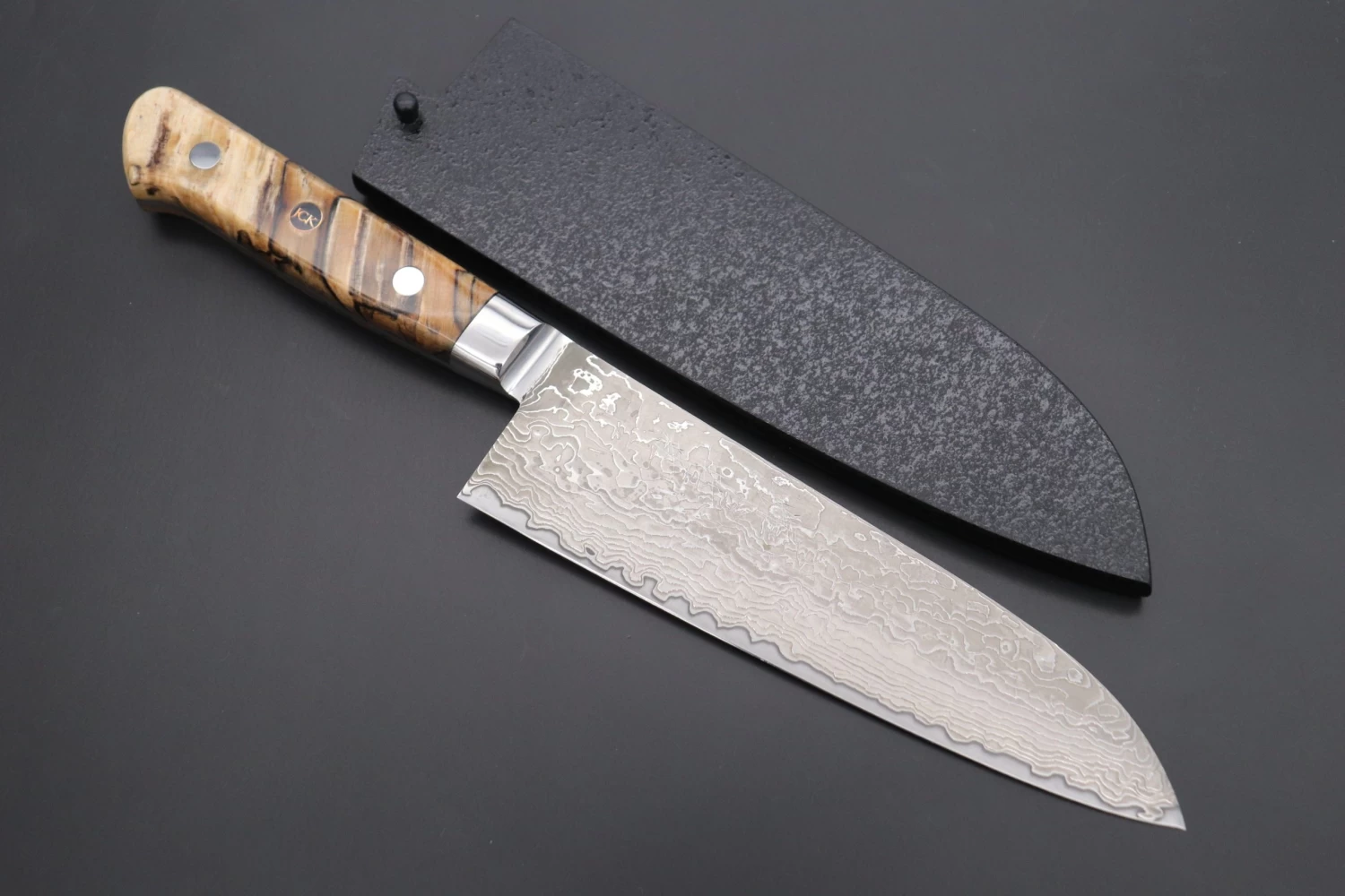 KAGAYAKI NOVEL R-2 Custom Damascus KNLTD-128 Santoku 175mm Knife comes with a Beautiful Natural Wood Grain texture, Custom Handmade Stabilized Spalted Wood handle, that is carefully hand countered and polished to ensure a comfortable&secure grip and beautiful appearance. Each knife is supplied with a matching wooden Saya (Sheath), which has been finished with a decorative black lacquer that complements the appearance of the Dark Damascus blade very well.