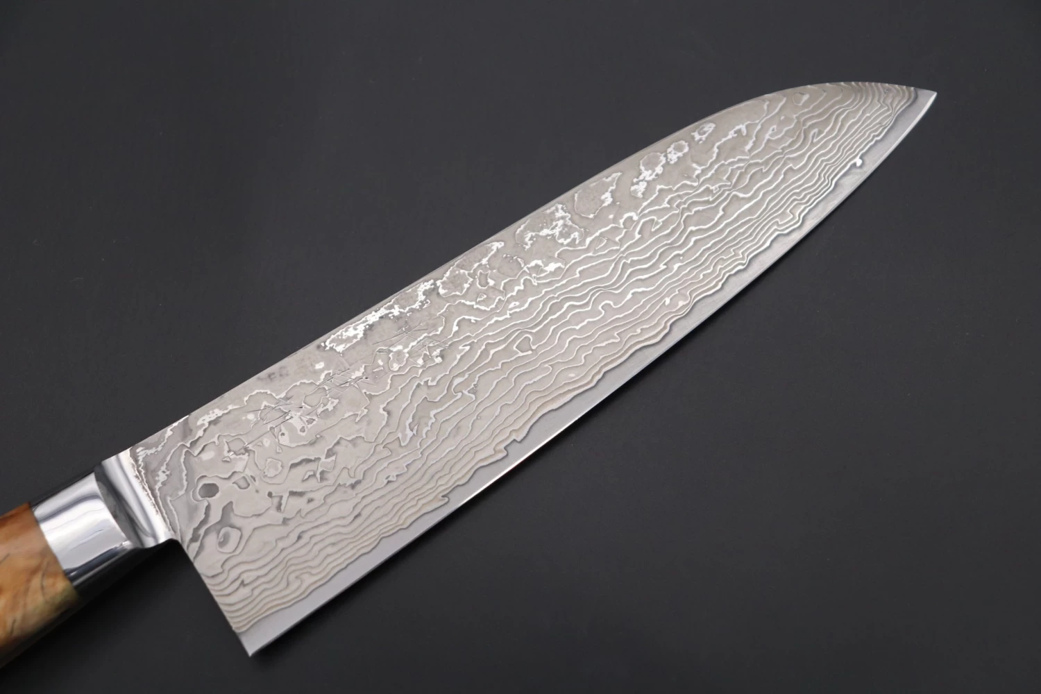 KAGAYAKI NOVEL R-2 Custom Damascus KNLTD-129 Santoku 175mm Knife comes with a Beautiful Natural Wood Grain texture, Custom Handmade Stabilized Spalted Wood handle, that is carefully hand countered and polished to ensure a comfortable&secure grip and beautiful appearance. Each knife is supplied with a matching wooden Saya (Sheath), which has been finished with a decorative black lacquer that complements the appearance of the Dark Damascus blade very well.