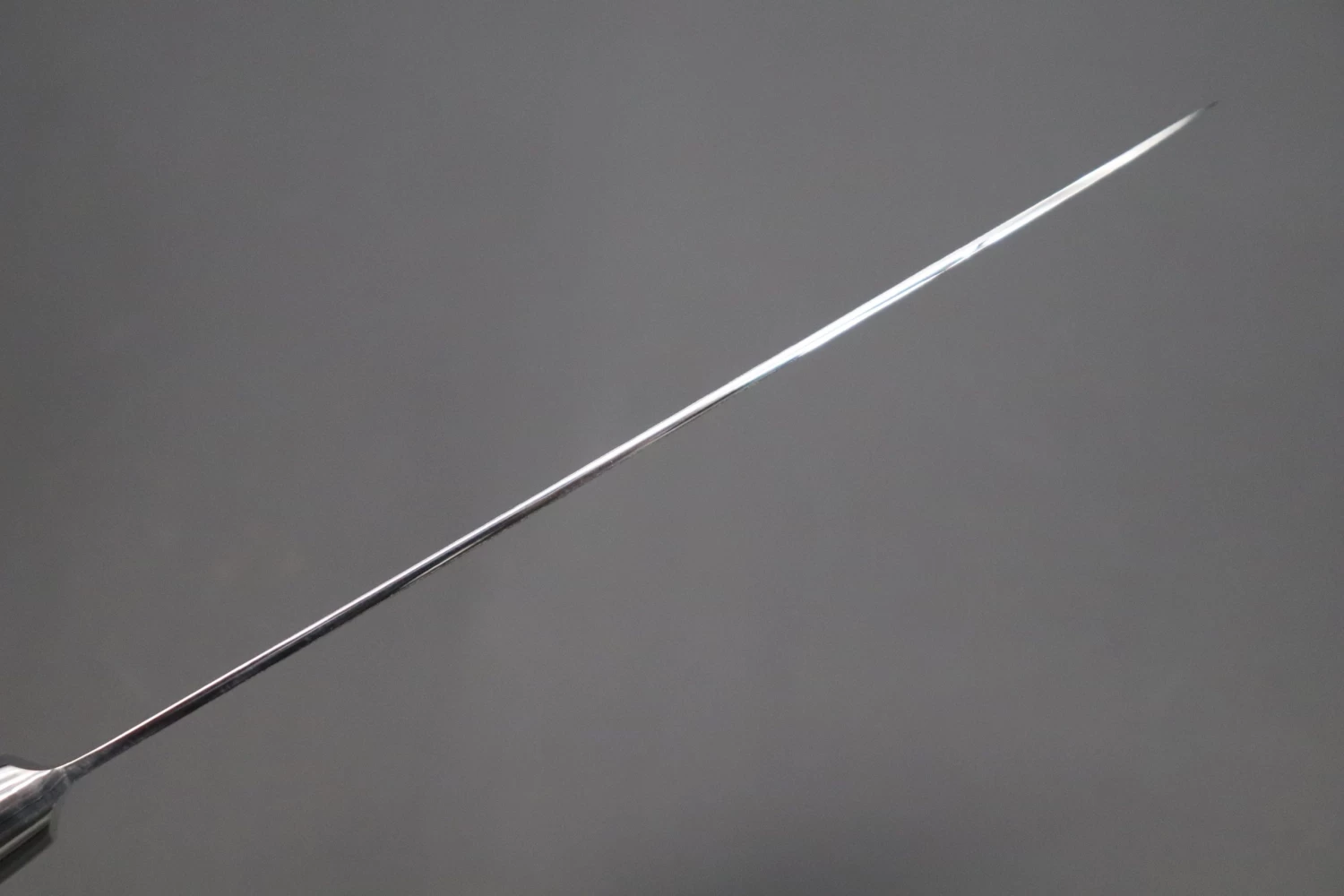 In order to satisfy new market demands, including those of a large number of experienced users and knife enthusiasts, Master Gotou has been refining his techniques for making a new generation of special steel knives. Master Gotou selected a special Powdered Metallurgy High Speed Tool Steel called “R-2”, which he heat treats to HRc. 63. R-2 is produced by a highly reputable Japanese company called Kobelco and offers remarkable cutting performance and edge retention.