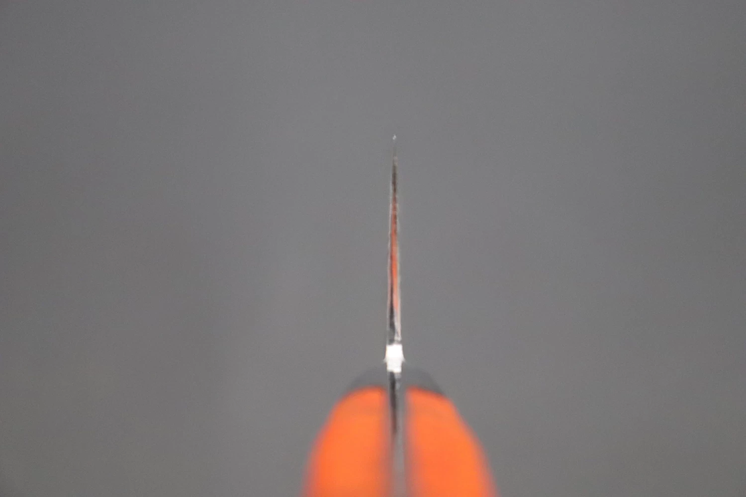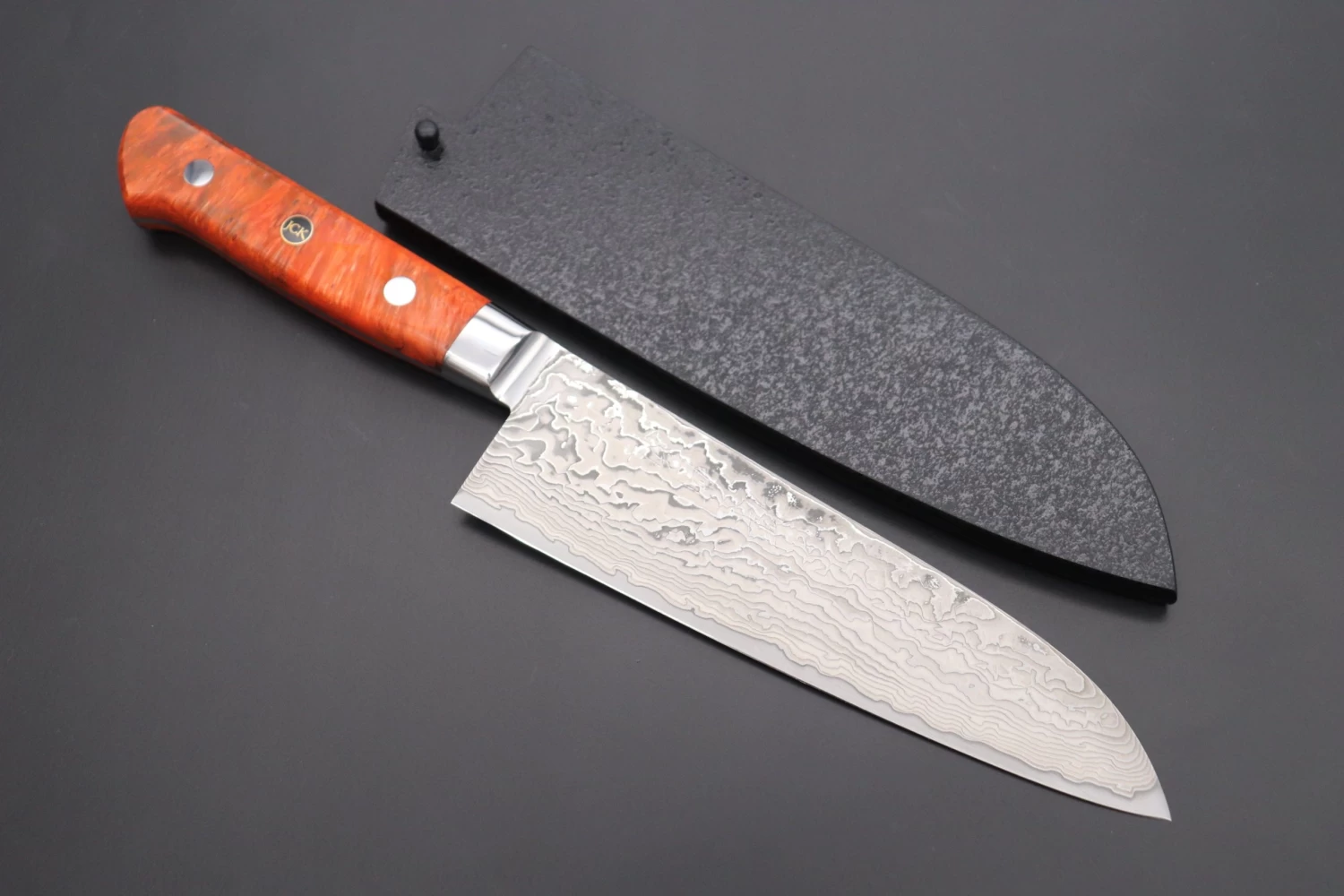 KAGAYAKI NOVEL R-2 Custom Damascus KNLTD-131 Santoku 175mm Knife comes with a Beautiful Custom Handcrafted Stabilized Suuny Orange Color Maple Wood Handle that is carefully hand contoured and polished to ensure both a beautiful appearance and a comfortable, secure grip. Each knife is supplied with a matching wooden Saya (Sheath), which has been finished with a decorative black lacquer that complements the appearance of the Dark Damascus blade very well.