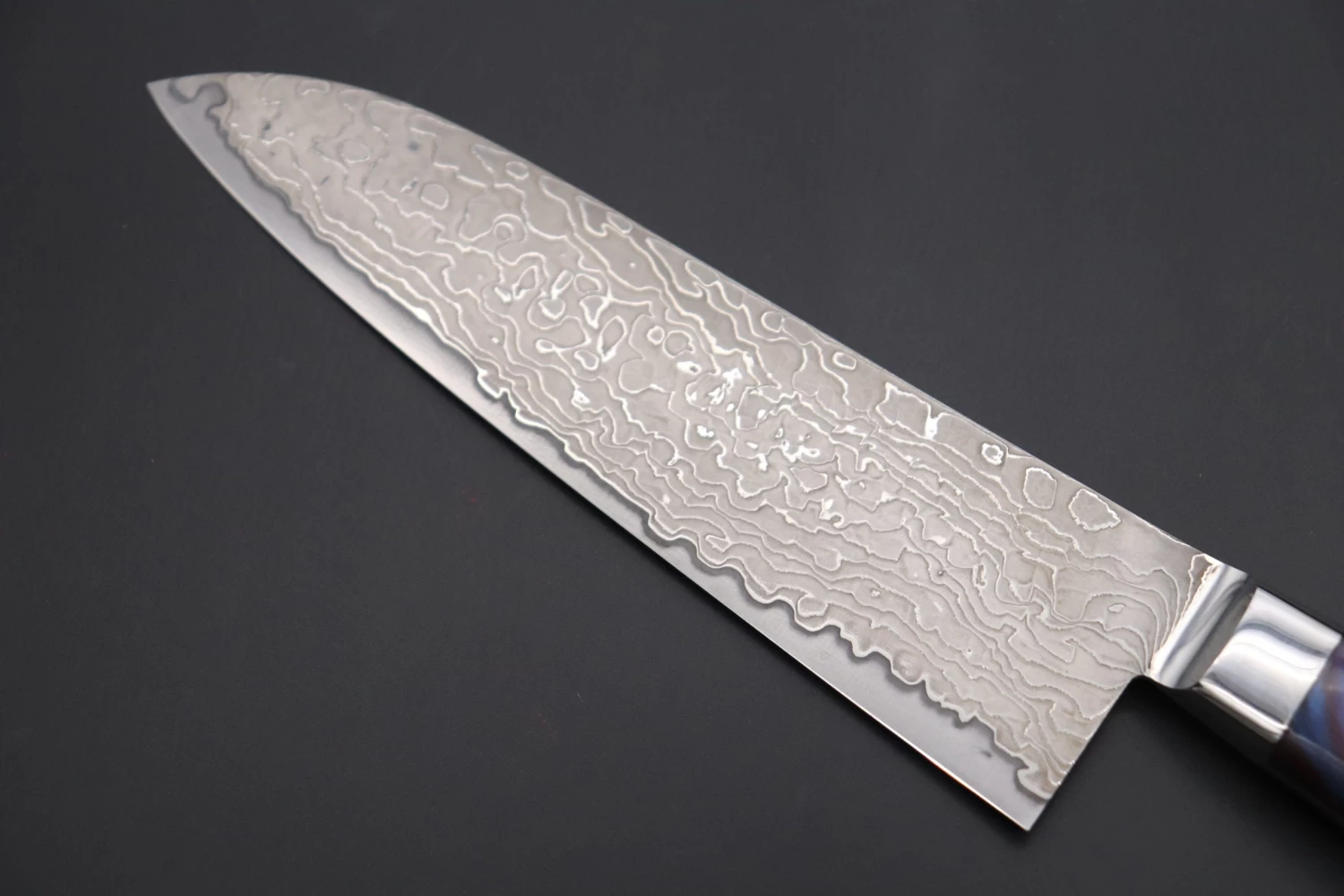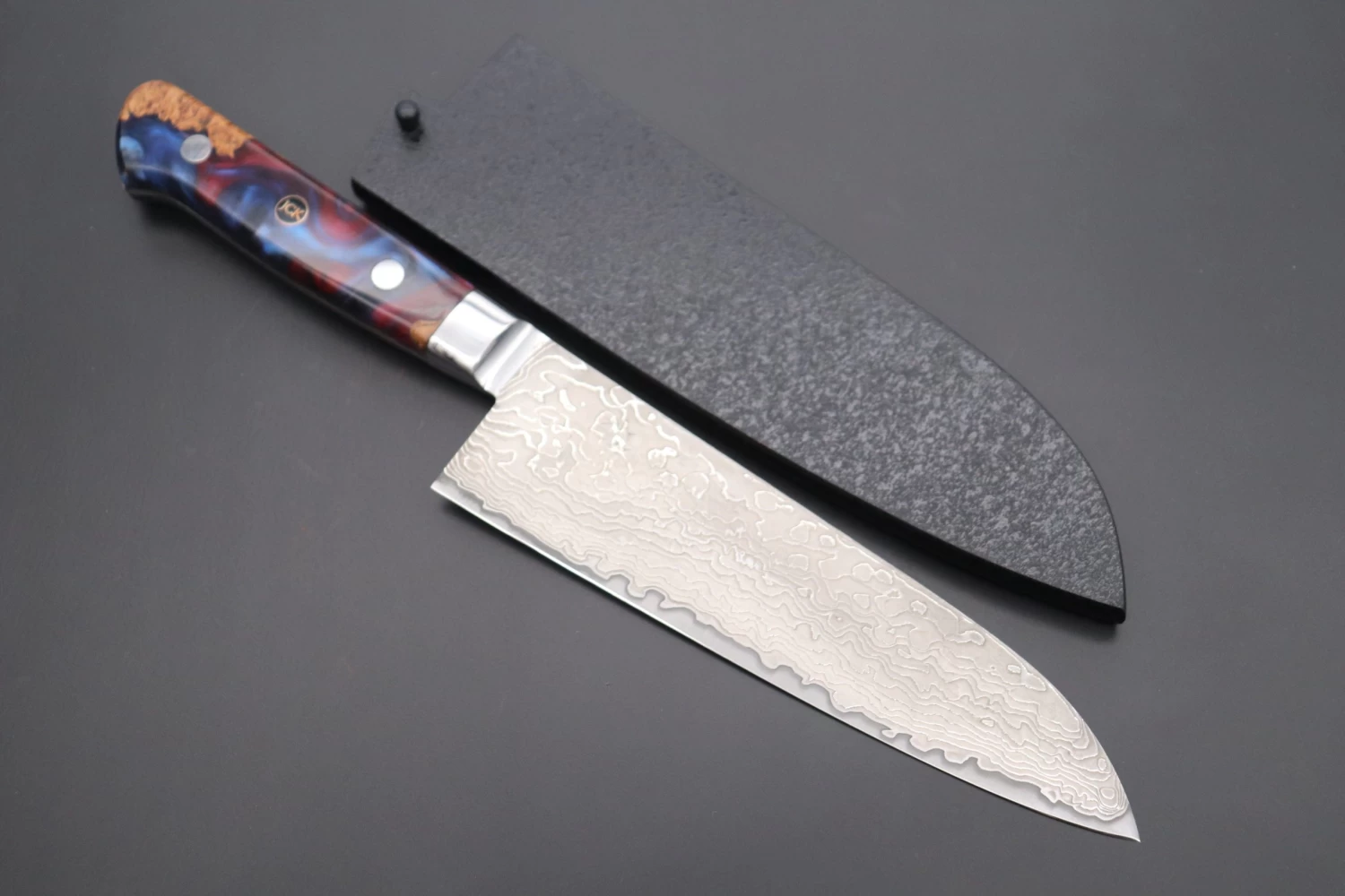 KAGAYAKI NOVEL R-2 Custom Damascus KNLTD-134 Santoku 175mm Knife comes with a beautiful and Stylish Purple Color Custom Handcrafted Stabilized Hybridwood handle that is carefully hand contoured and polished to ensure both a beautiful appearance and a comfortable, secure grip. Each knife is supplied with a matching wooden Saya (Sheath), which has been finished with a decorative black lacquer that complements the appearance of the Dark Damascus blade very well.