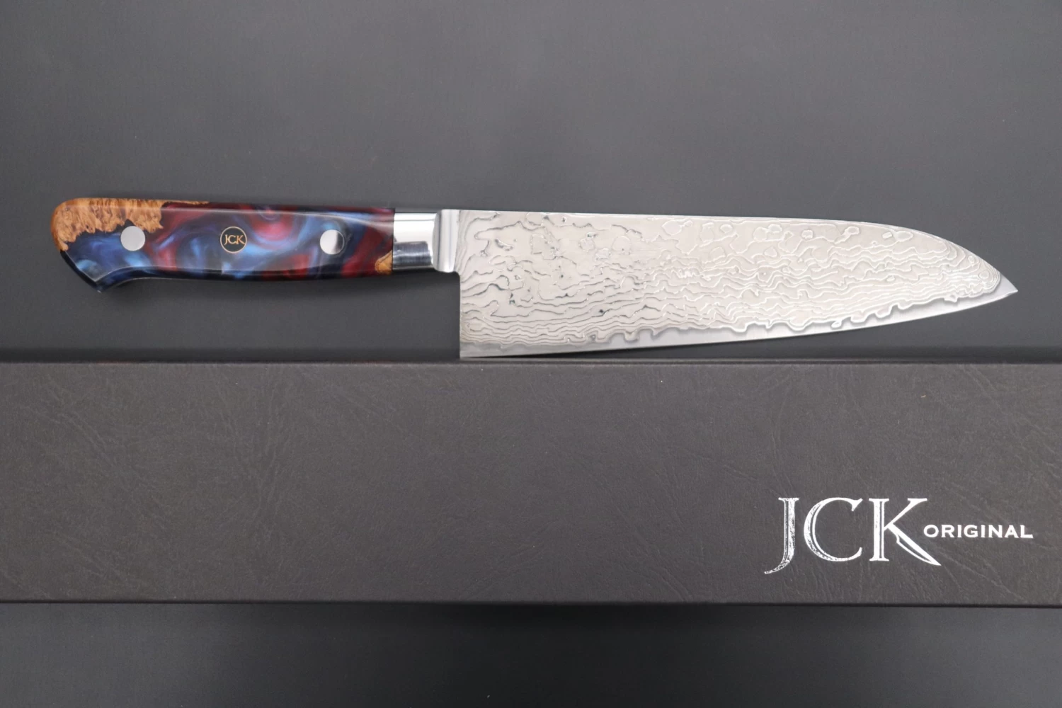 The knives feature full tang construction, premium handle scales, perfectly mirror polished stainless steel bolster and a Handmade “JCK” Mosaic Pin that adds a stylish design accent.