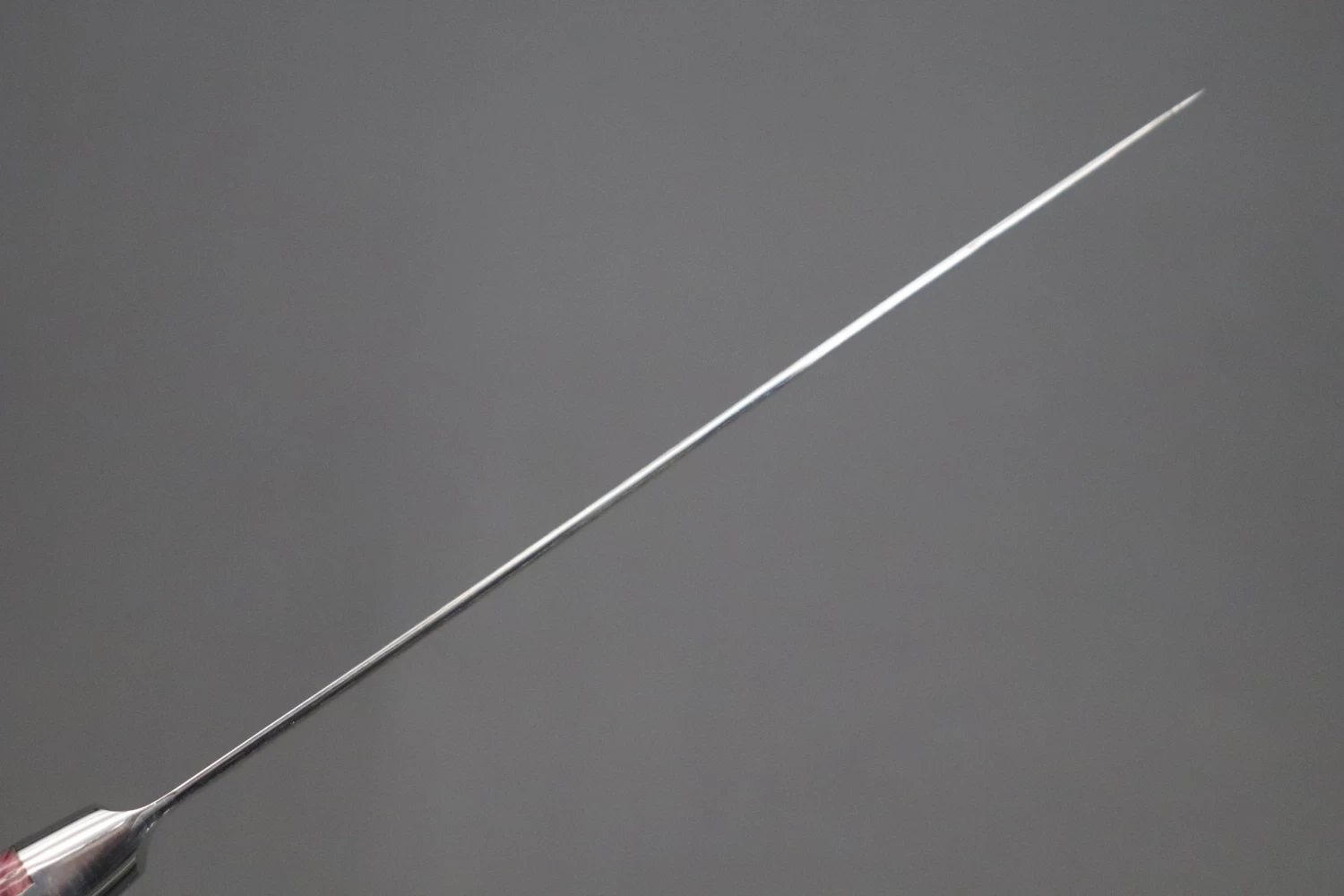 In order to satisfy new market demands, including those of a large number of experienced users and knife enthusiasts, Master Gotou has been refining his techniques for making a new generation of special steel knives. Master Gotou selected a special Powdered Metallurgy High Speed Tool Steel called “R-2”, which he heat treats to HRc. 63. R-2 is produced by a highly reputable Japanese company called Kobelco and offers remarkable cutting performance and edge retention.