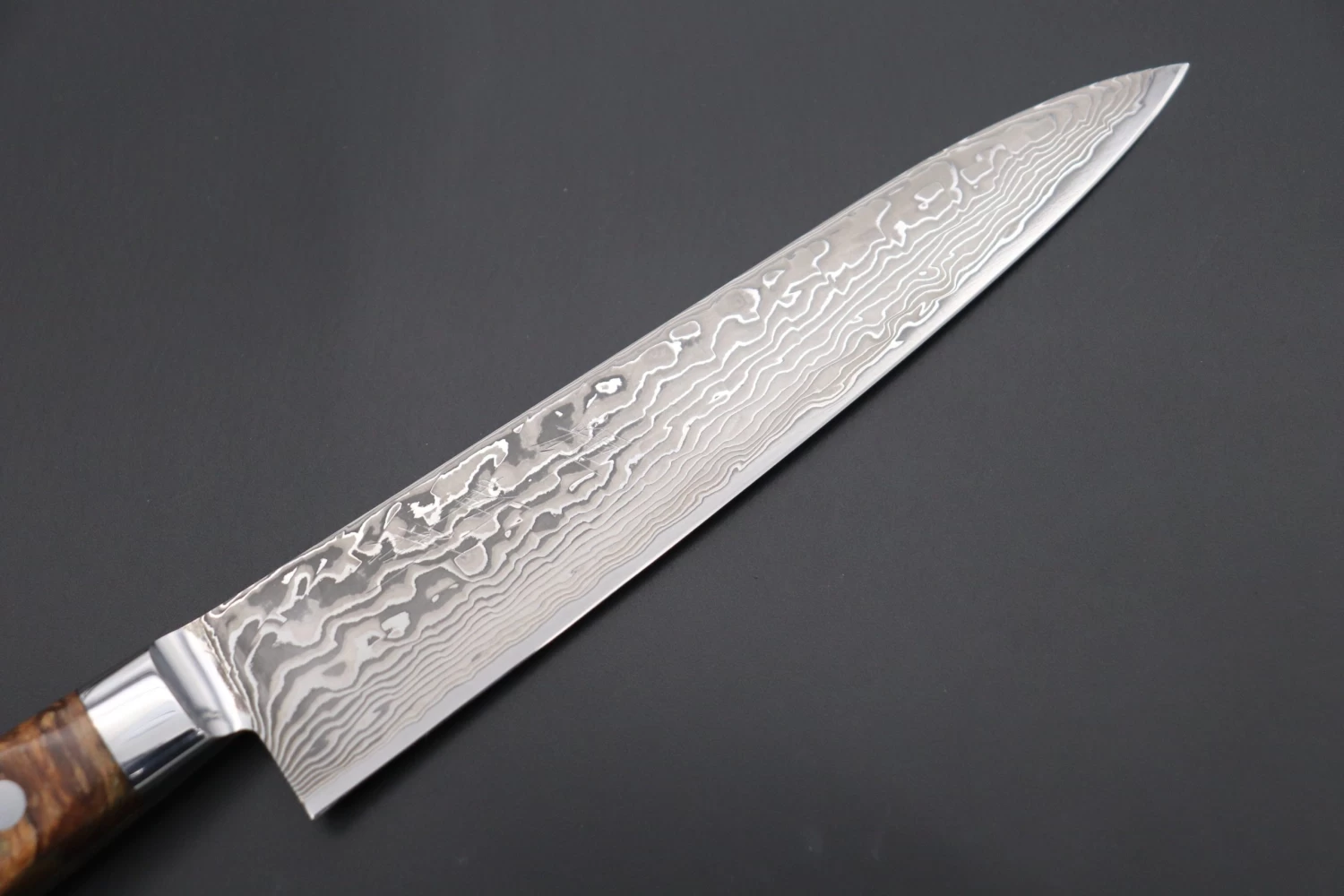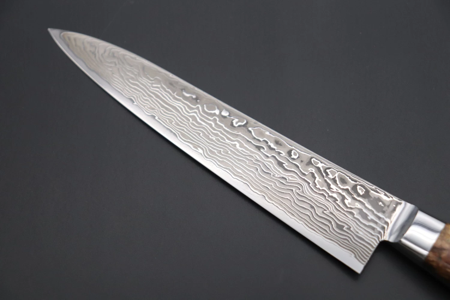 KAGAYAKI NOVEL R-2 Custom Damascus KNLTD-87 Petty 150mm Knife comes with a Beautiful Natural Wood Grain texture, Custom Handmade Stabilized Spalted Wood handle, that is carefully hand countered and polished to ensure a comfortable&secure grip and beautiful appearance. Each knife is supplied with a matching wooden Saya (Sheath), which has been finished with a decorative black lacquer that complements the appearance of the Dark Damascus blade very well.